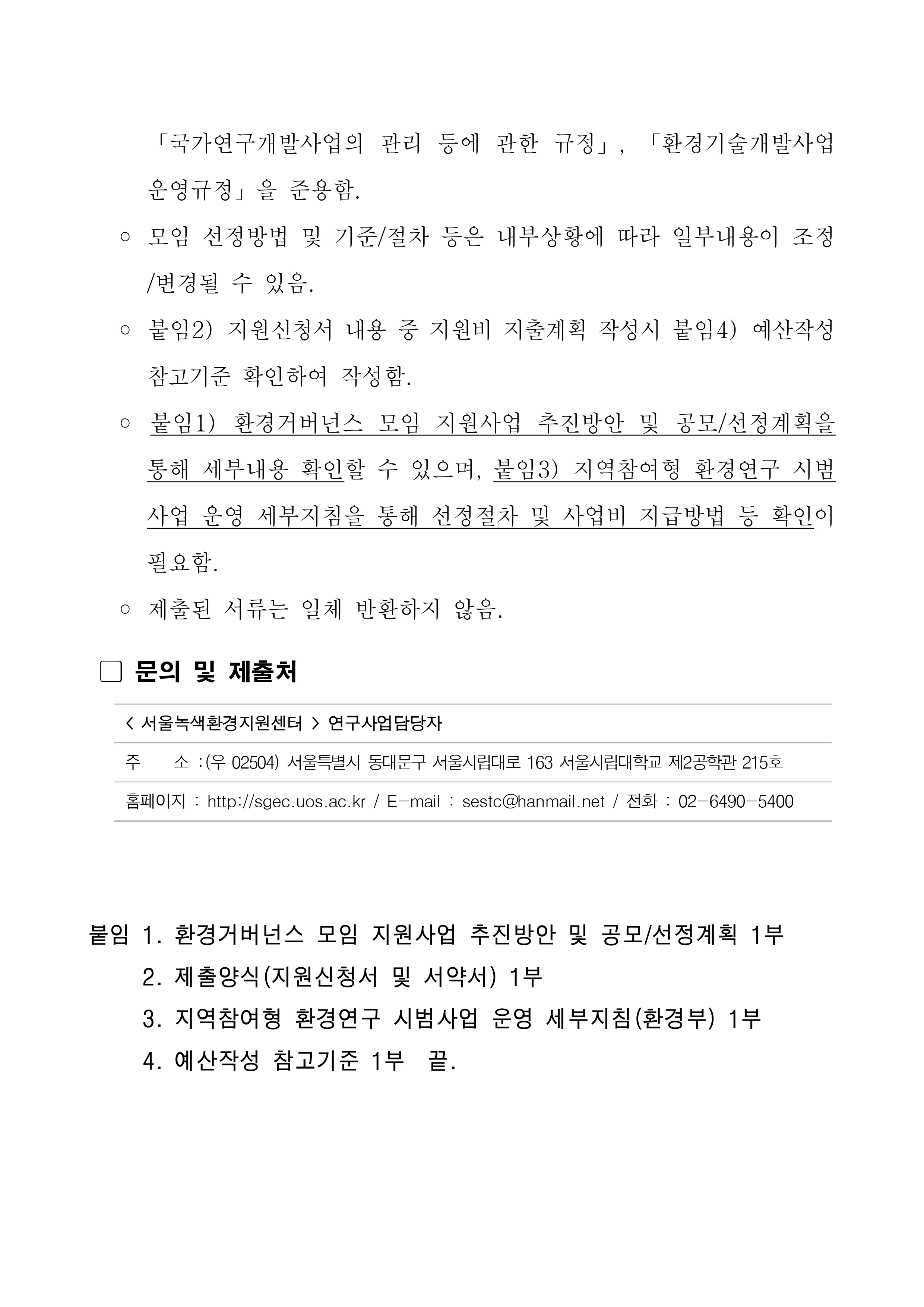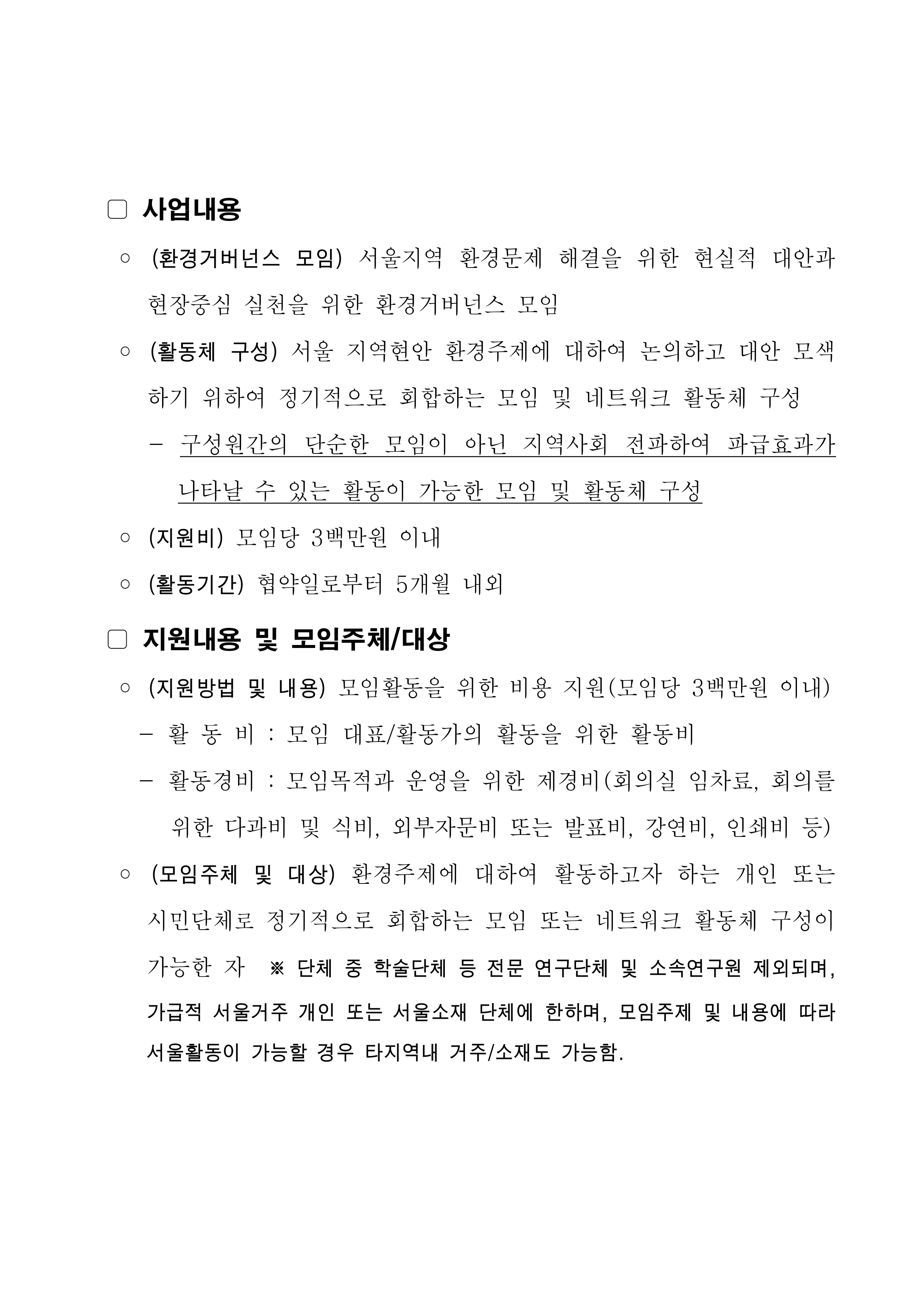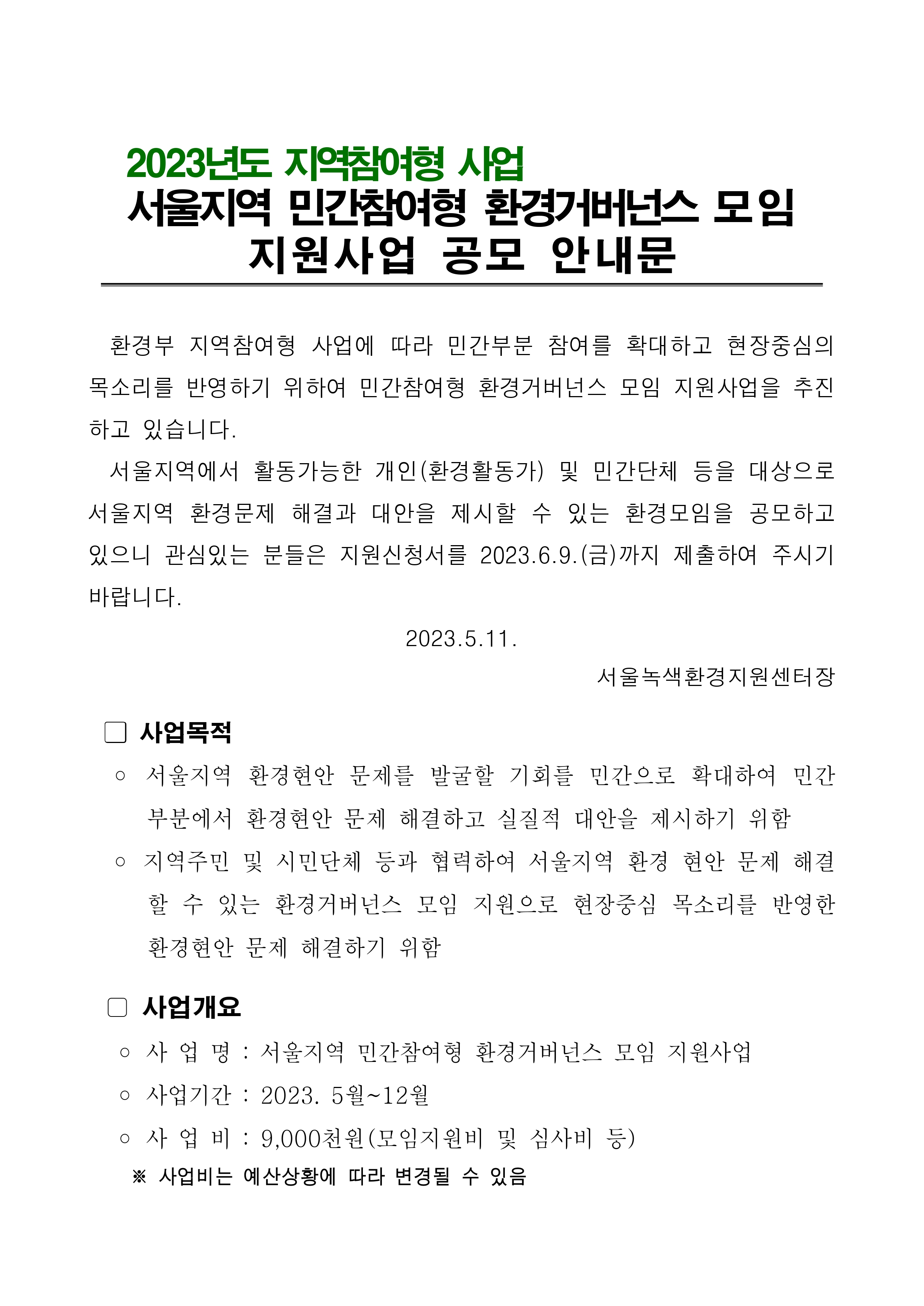 [서울녹색환경지원센터] 환경거버넌스 모임 지원사업 공모 안내 작성자 : 대한환경공학회 작성일 : 2023-05-18 조회수 : 236 참고자료)환경부 지역 참여형 환경연구 시범사업 운영 세부지침(모임).hwp (다운로드 : 89회) 참고자료)예산작성 참고기준.hwp (다운로드 : 92회) 2023년도 지역참여형 환경모임 지원신청서(시민실천모임).hwp (다운로드 : 86회) 2023년도 지역참여형 환경모임추진및공모계획.pdf (다운로드 : 134회) 2023년도 지역참여형 환경모임 지원신청서(서울형 정책제시 모임).hwp (다운로드 : 81회) 2023년도 지역참여형 환경모임 공고문.pdf (다운로드 : 114회) 목록