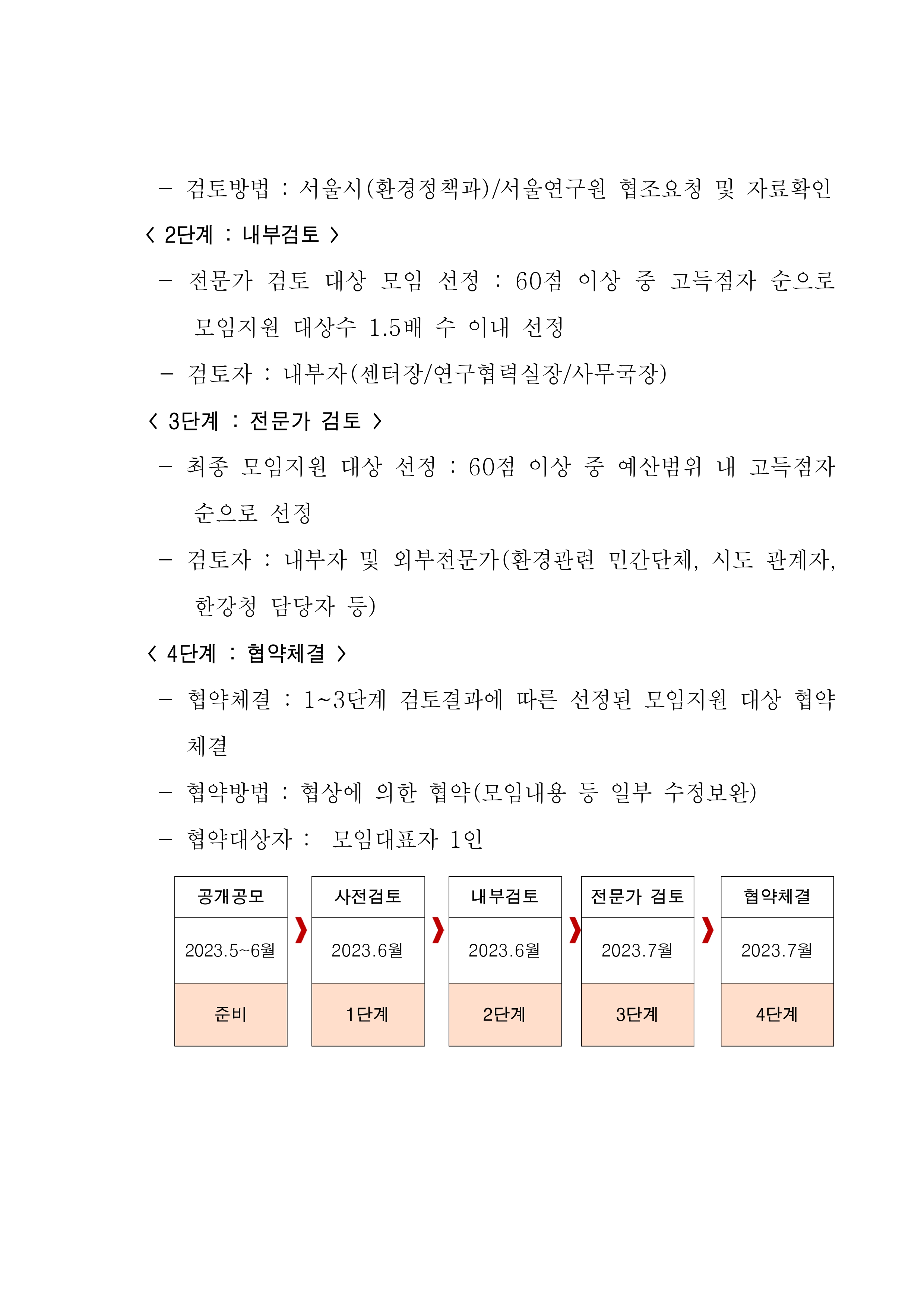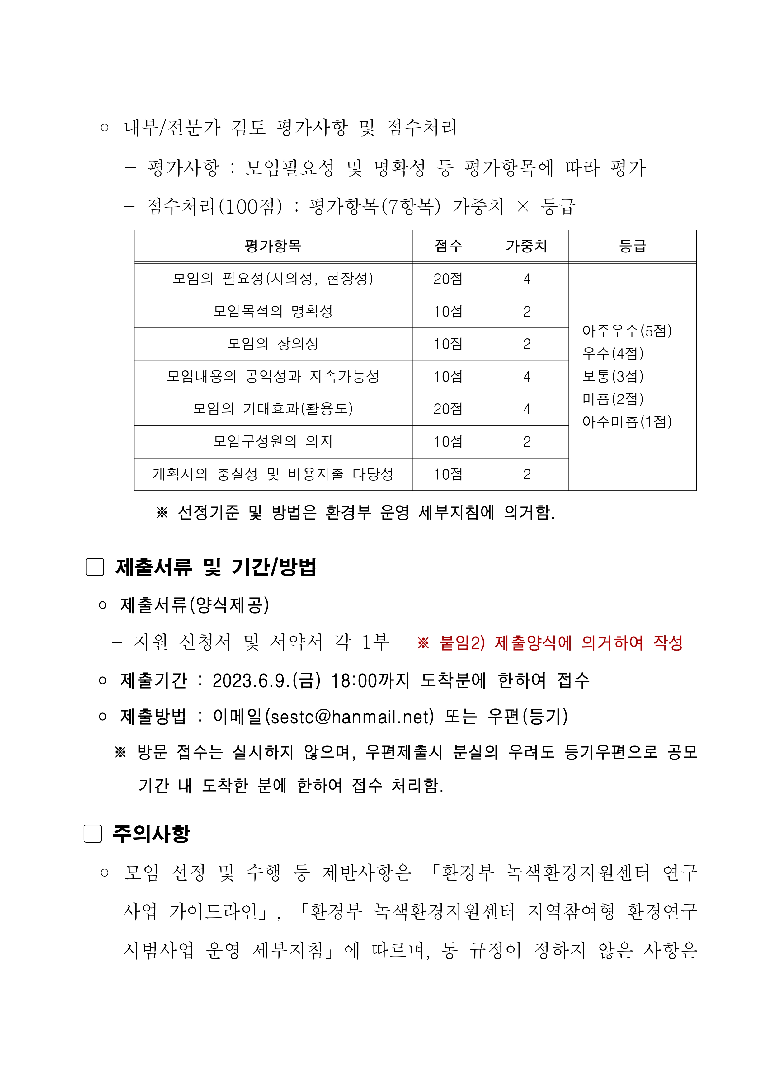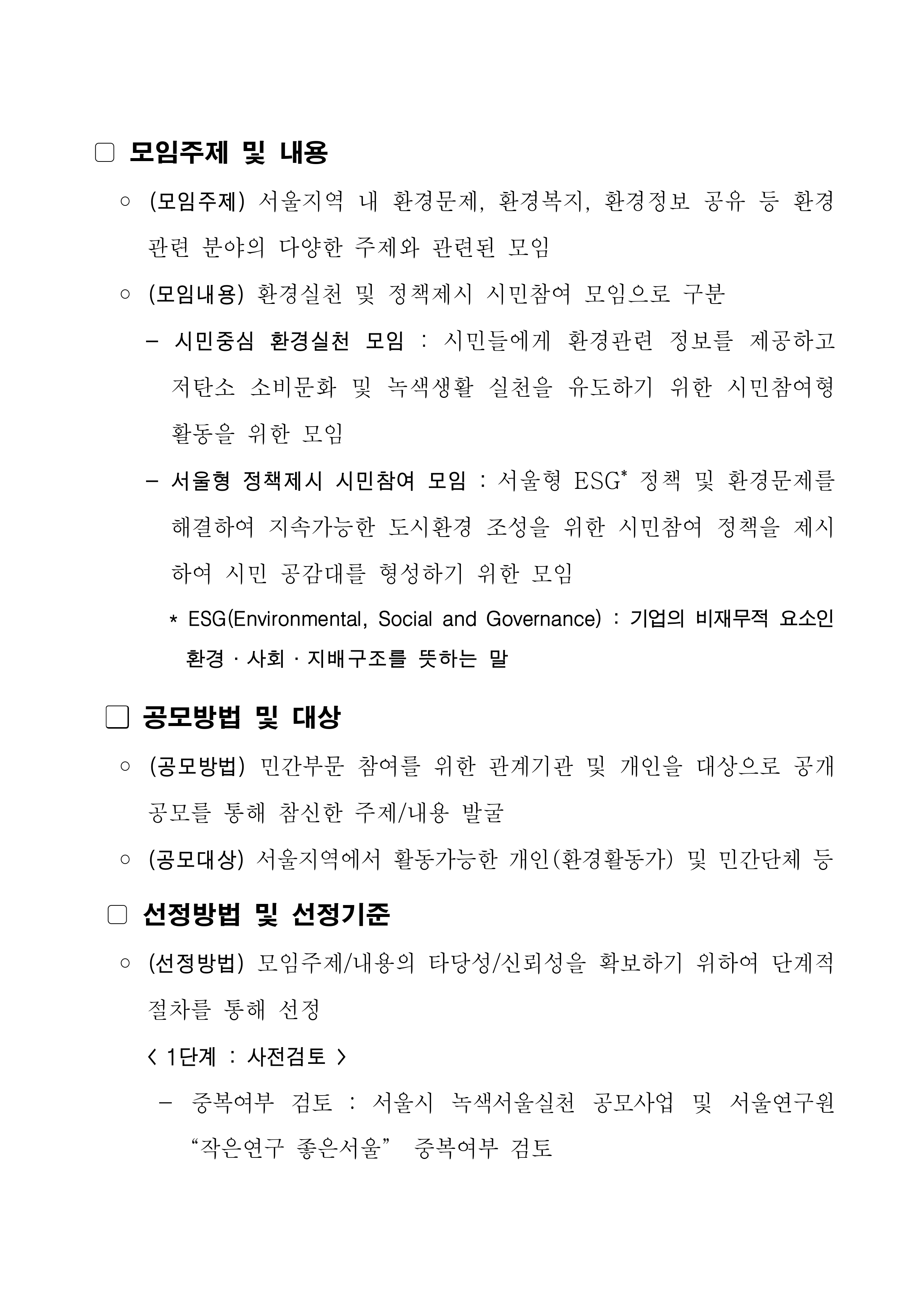 [서울녹색환경지원센터] 환경거버넌스 모임 지원사업 공모 안내 작성자 : 대한환경공학회 작성일 : 2023-05-18 조회수 : 236 참고자료)환경부 지역 참여형 환경연구 시범사업 운영 세부지침(모임).hwp (다운로드 : 89회) 참고자료)예산작성 참고기준.hwp (다운로드 : 92회) 2023년도 지역참여형 환경모임 지원신청서(시민실천모임).hwp (다운로드 : 86회) 2023년도 지역참여형 환경모임추진및공모계획.pdf (다운로드 : 134회) 2023년도 지역참여형 환경모임 지원신청서(서울형 정책제시 모임).hwp (다운로드 : 81회) 2023년도 지역참여형 환경모임 공고문.pdf (다운로드 : 114회) 목록