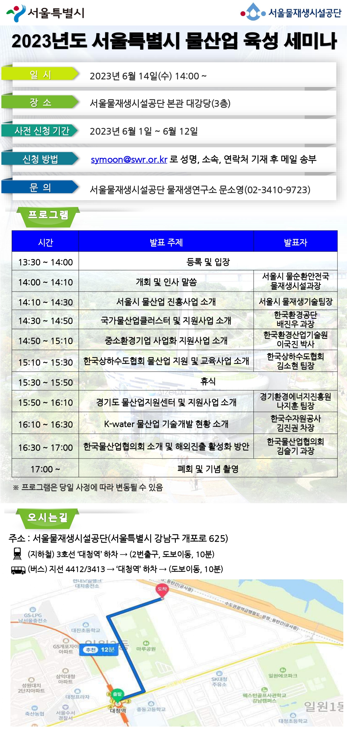 [서울물재생시설공단 물재생연구소] 서울특별시 물산업 육성 세미나 안내 작성자 : 대한환경공학회 작성일 : 2023-05-30 조회수 : 376 붙임1. 2023년도 서울특별시 물산업 육성 세미나 초대장.pdf (다운로드 : 115회) 목록