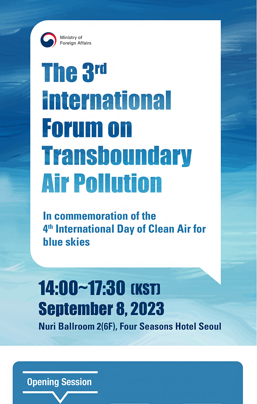 [외교부] ‘2023 푸른 하늘의 날’ 기념 월경성 대기오염 대응 국제포럼 | 9월8일(금) 14:00~16:30 작성자 : 대한환경공학회 작성일 : 2023-08-30 조회수 : 285 목록