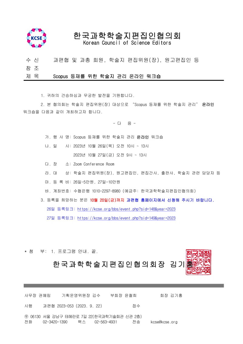 [과편협] Scopus 등재를 위한 학술지 관리 온라인 워크숍 작성자 : 대한환경공학회 작성일 : 2023-10-11 조회수 : 388 2023-053[첨부1]_Scopus_등재를_위한_학술지_관리_프로그램_안내_r1.hwp (다운로드 : 108회) 과편협_2023-053_(Scopus_등재를_위한_학술지_관리_온라인_워크숍).pdf (다운로드 : 104회) 목록