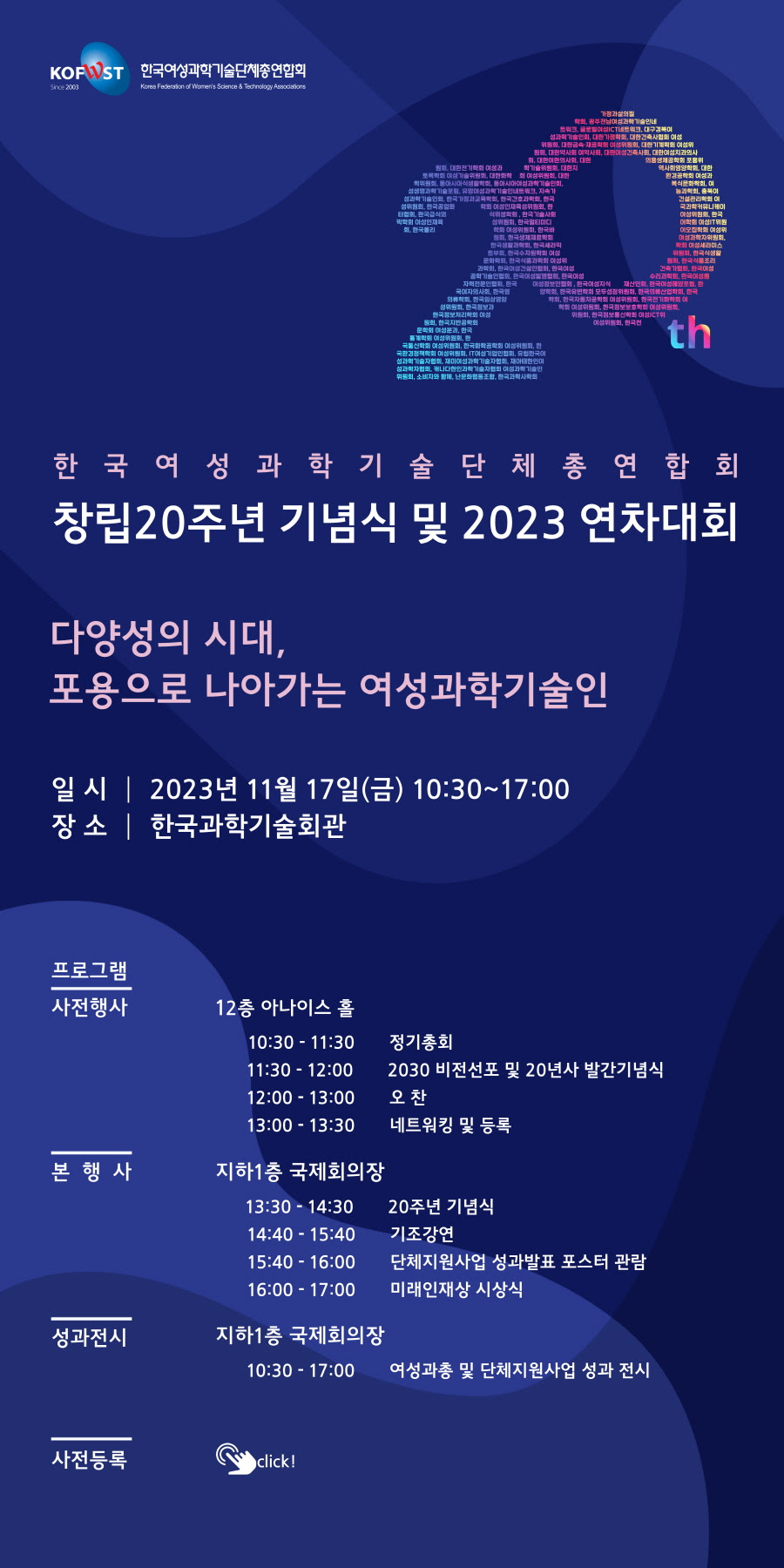 [여성과총] 창립20주년 기념식 및 2023연차대회에 초대합니다! 작성자 : 대한환경공학회 작성일 : 2023-11-09 조회수 : 208 안녕하십니까. 한국여성과학기술단체총연합회입니다. 여성과총 창립 20주년 기념식 및 2023 연차대회가'다양성의 시대, 포용으로 나아가는 여성과학기술인'을 주제로 개최됩니다. 많은 관심과 참여를 부탁드립니다. * 사전등록 시 아래 웹초대장 이미지를 클릭하시거나 다음 링크를 클릭해주세요. 사전등록 링크https://docs.google.com/forms/d/1GIYdUL2I60IKZoJxWRbOfhp59SNcWm31t25tMEgPD1Q/edit#responses 목록