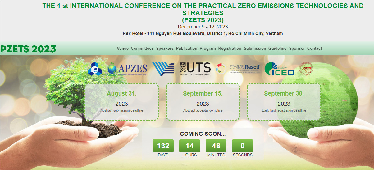 The 1st International Conference on the Practical Zero Emissions Technologies and Strategies (PZETS 2023) and the 2nd Workshop on Water Sustainability & Green Technology will be organized by the Australasia Practical Zero Emissions Society (APZES) and hosted by Ho Chi Minh University of Technology (HCMUT), Vietnam National University Ho Chi Minh (VNU-HCM). This PZETS 2023 will be held from 9 to 12 December 2023 in Ho Chi Minh City, Vietnam. The main objective of PZETS 2023 is to provide a global platform to discuss and exchange ideas, challenges, and studies related to zero-emission issues.