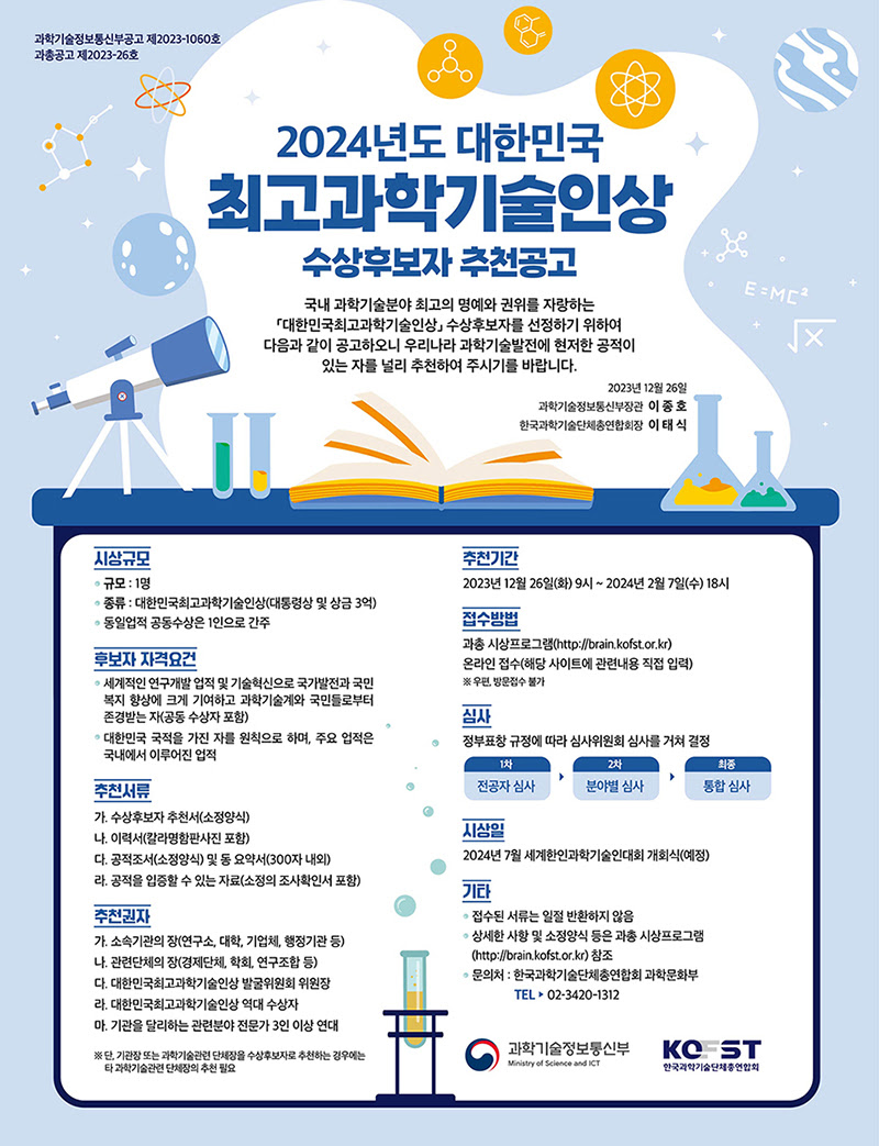 [과총]2024년도 『대한민국최고과학기술인상』 수상후보자 추천 공고 작성자 : 대한환경공학회 작성일 : 2023-12-29 조회수 : 290 (최종_공고번호)_2024년_대한민국최고과학기술인상_수상후보자_추천_공고문(안).pdf (다운로드 : 32회) 목록
