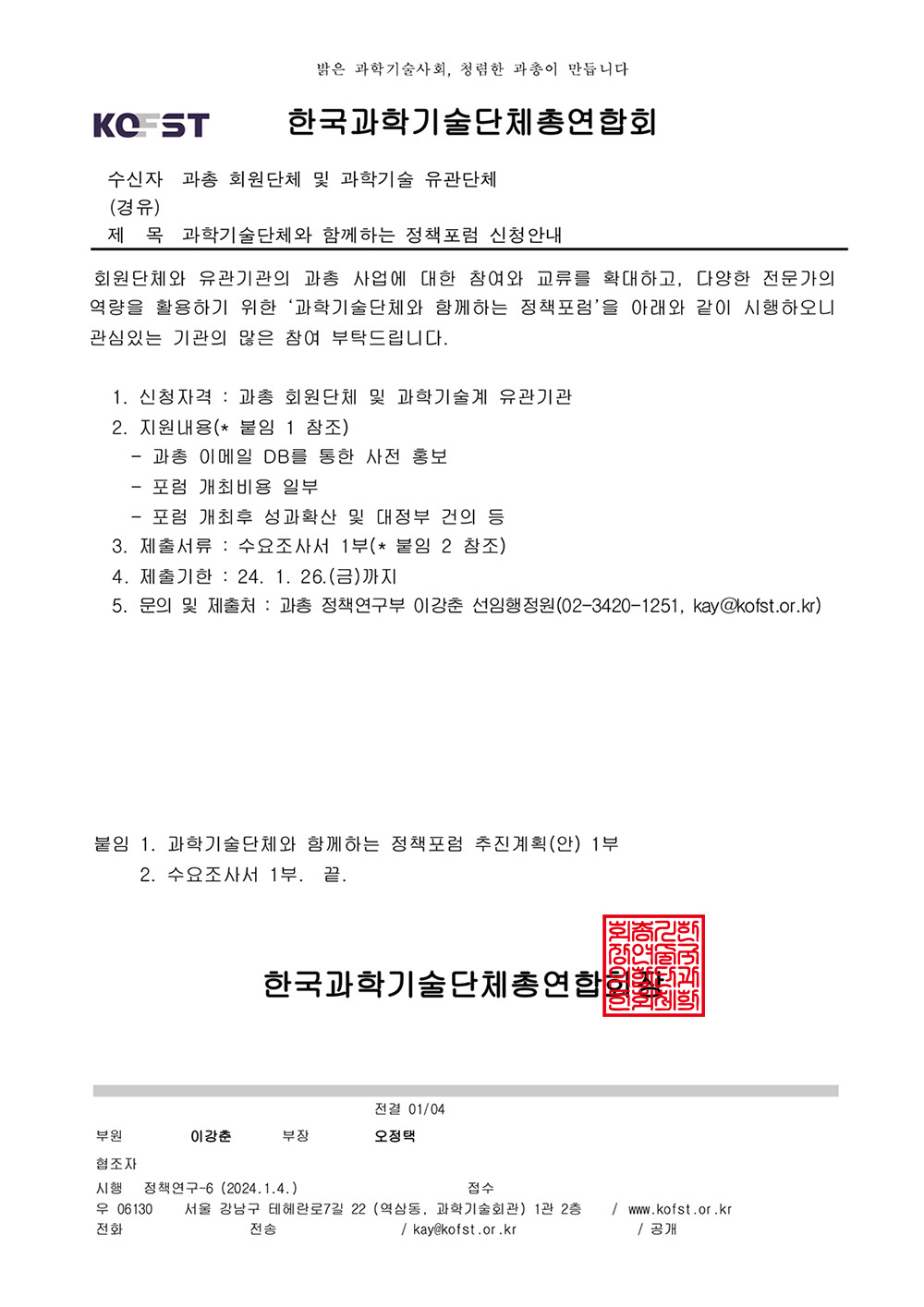 [과총] 과학기술단체와 함께하는 정책포럼 신청안내 작성자 : 대한환경공학회 작성일 : 2024-01-12 조회수 : 322 붙임_2._수요조사서_양식.hwp (다운로드 : 38회) 붙임_1._공동포럼_계획(안).pdf (다운로드 : 42회) (공문)과학기술단체와_함께하는_정책포럼_신청안내.pdf (다운로드 : 53회) 목록