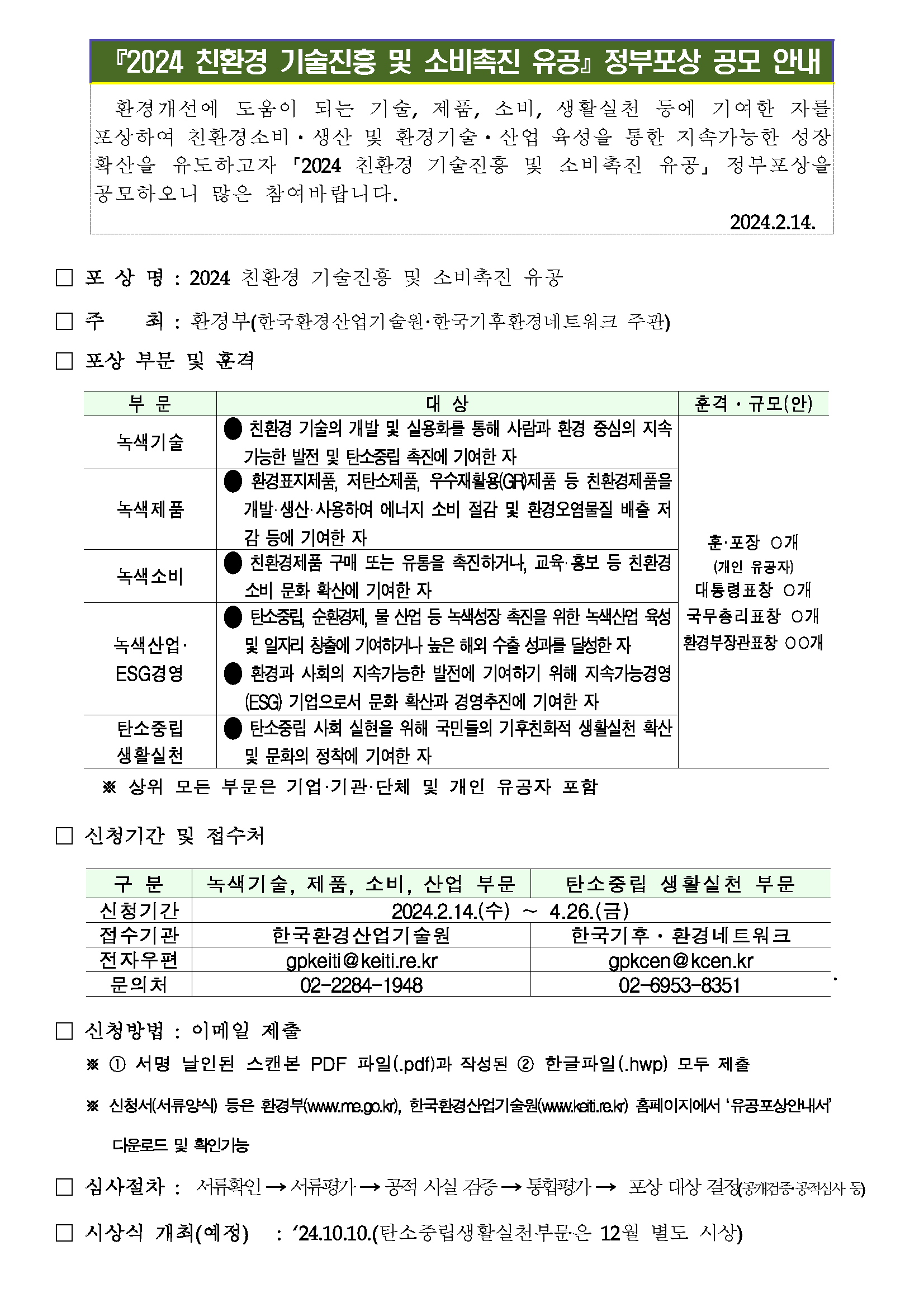 [환경부/한국환경산업기술원]'2024 친환경 기술진흥 및 소비촉진 유공' 정부포상 공모 안내 작성자 : 대한환경공학회 작성일 : 2024-02-21 조회수 : 437 1_ 2024 친환경 기술진흥 및 소비촉진 유공 공모 안내(공고문).pdf (다운로드 : 50회) 2_ 2024친환경기술진흥및소비촉진유공포상안내서.hwp (다운로드 : 36회) 3_ 제출서류 양식 및 작성요령(개인,기관ㆍ단체).egg (다운로드 : 38회) 목록