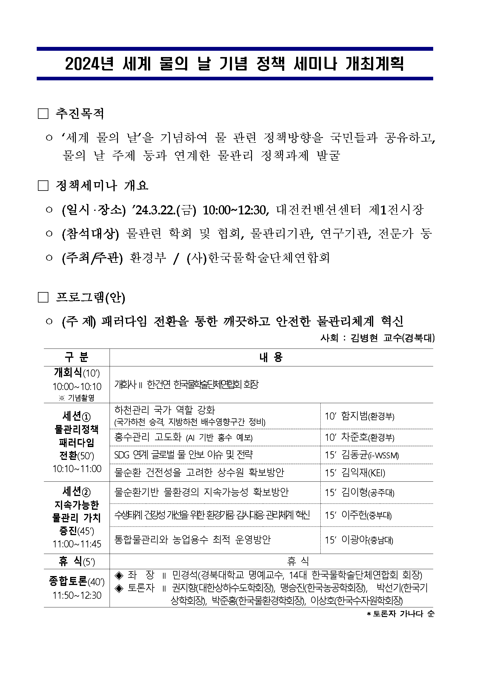 2024년 세계 물의 날을 기념하여 오는 3월 22일(금) 오전 10시, 대전컨벤션센터에서 정책세미나를 아래와 같이 개최합니다.