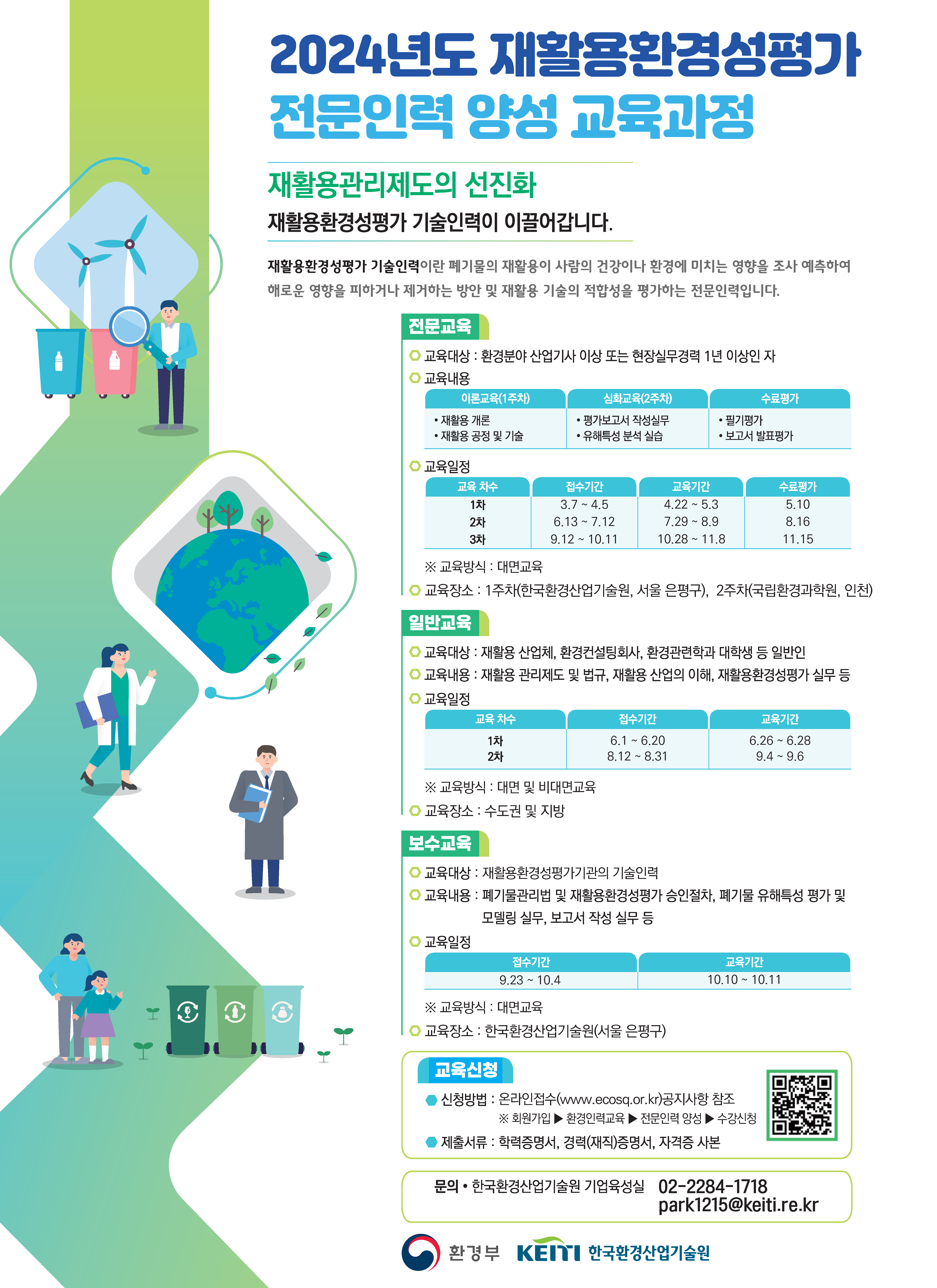 [한국환경산업기술원] 2024년도 1차 재활용환경성평가 전문인력 양성과정 교육생 모집 안내 작성자 : 대한환경공학회 작성일 : 2024-03-08 조회수 : 318 24-1차 재활용환경성평가 교육과정 포스터.pdf (다운로드 : 42회) 24-1차 재활용환경성평가 전문인력 양성과정 교육생 모집 안내문.pdf (다운로드 : 39회) 목록
