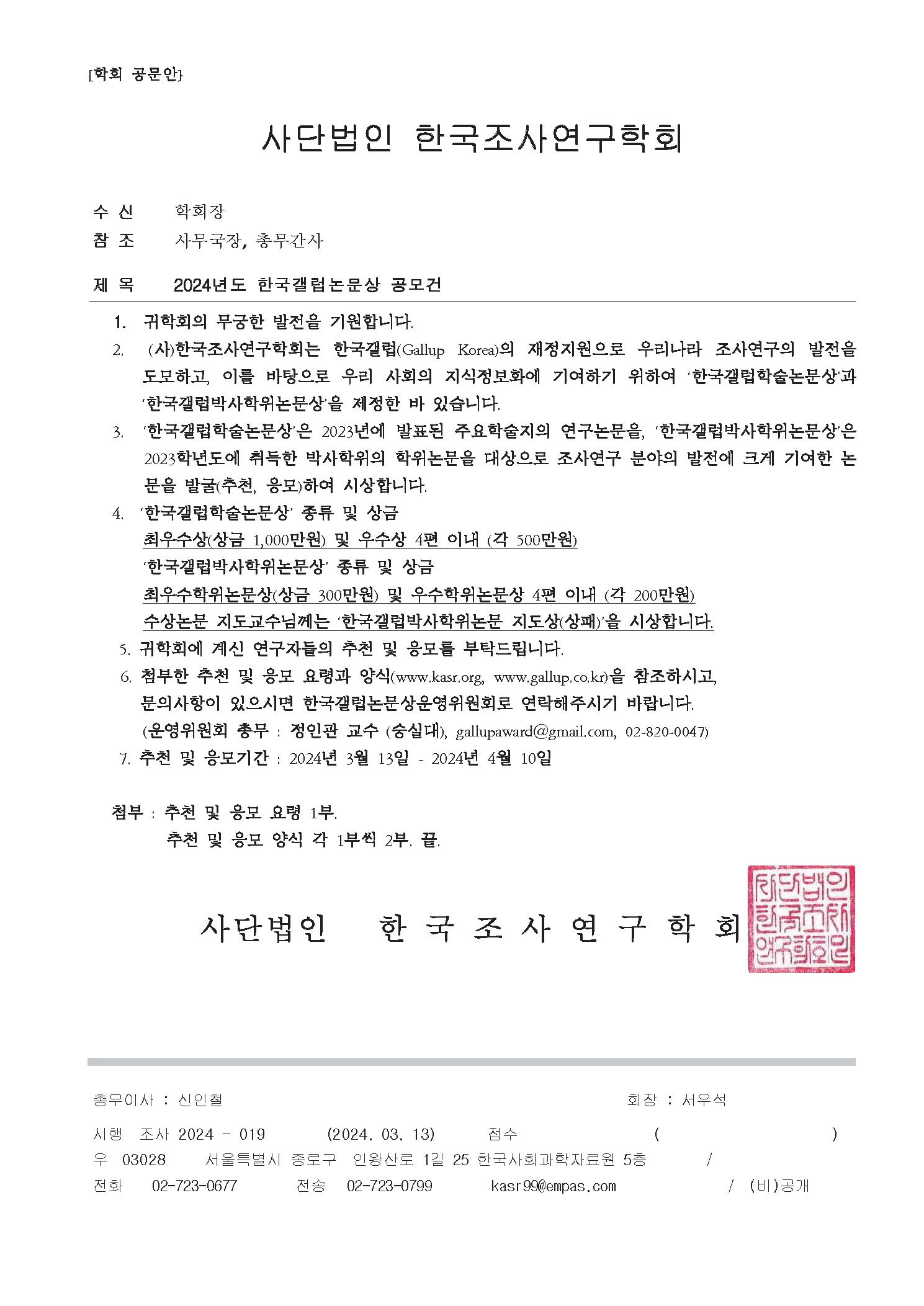[한국조사연구학회] 2024년 한국갤럽학술논문상 및 한국갤럽박사학위논문상 추천 및 응모 안내 작성자 : 대한환경공학회 작성일 : 2024-03-13 조회수 : 268 2024-019(한국갤럽상 공모)_학회공문.pdf (다운로드 : 59회) 한국갤럽학술논문상 및 박사학위논문상_추천 및 응모 요령.hwp (다운로드 : 43회) 목록