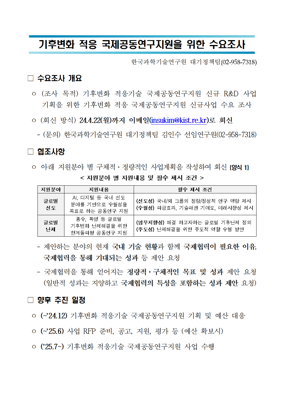 [KIST 청정대기센터] 기후변화 적응 국제공동연구지원을 위한 수요조사 참여 안내 작성자 : 대한환경공학회 작성일 : 2024-04-15 조회수 : 368 기후변화 적응 국제공동연구지원을 위한 수요조사 (조사 목적) 기후변화 적응기술 국제공동연구지원 신규 R&D 사업 기획을 위한 기후변화 적응 국제공동연구지원 신규사업 수요 조사(기한) 4월 22일(월요일)까지(제출자료) 수요조사서(붙임 2)(제출방법) 이메일 ( insukim@kist.re.kr )(문의) 한국과학기술연구원 대기정책팀 김인수 선임연구원 ( 02-958-7318 ) 붙임 2. 기후변화 적응 국제공동연구지원 수요조사 제출양식.hwp (다운로드 : 63회) 붙임 1. 기후변화 적응 국제공동연구지원 수요조사 설명문.hwp (다운로드 : 69회) 목록