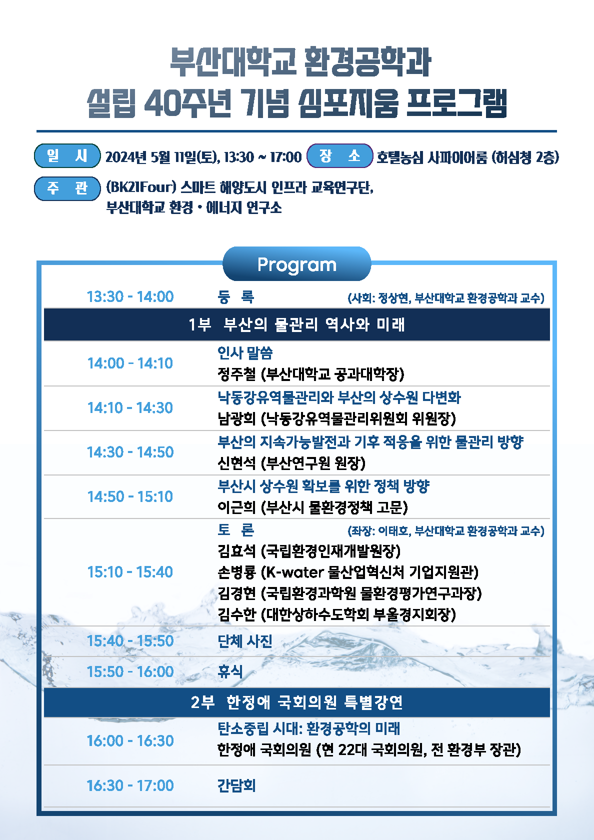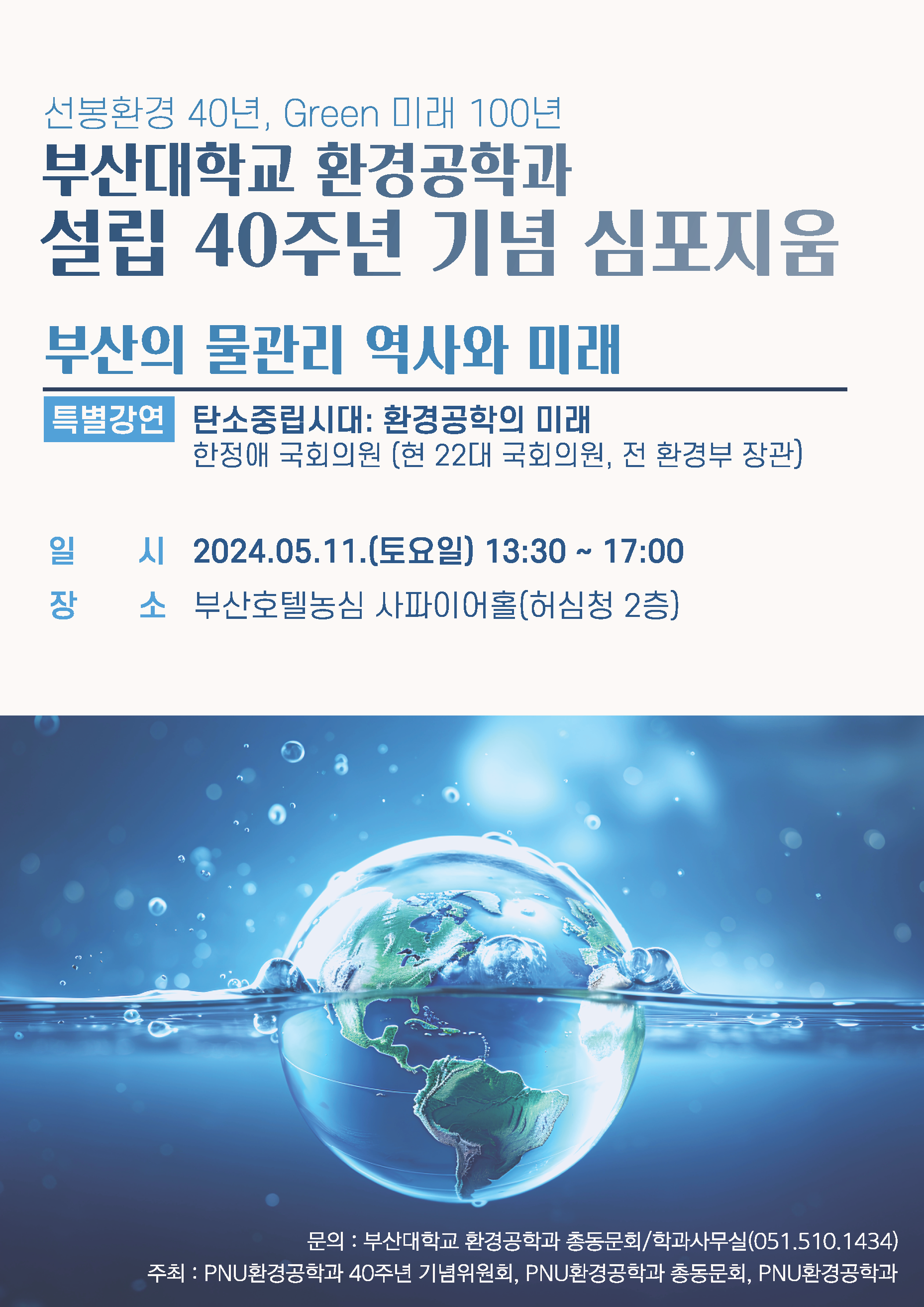 [부산대학교 환경공학과] 설립 40주년 기념 「부산의 물관리 역사와 미래」심포지엄 개최 안내 작성자 : 대한환경공학회 작성일 : 2024-04-29 조회수 : 471 부산대학교 환경공학과 설립 40주년 기념 심포지움.pdf (다운로드 : 57회) 목록