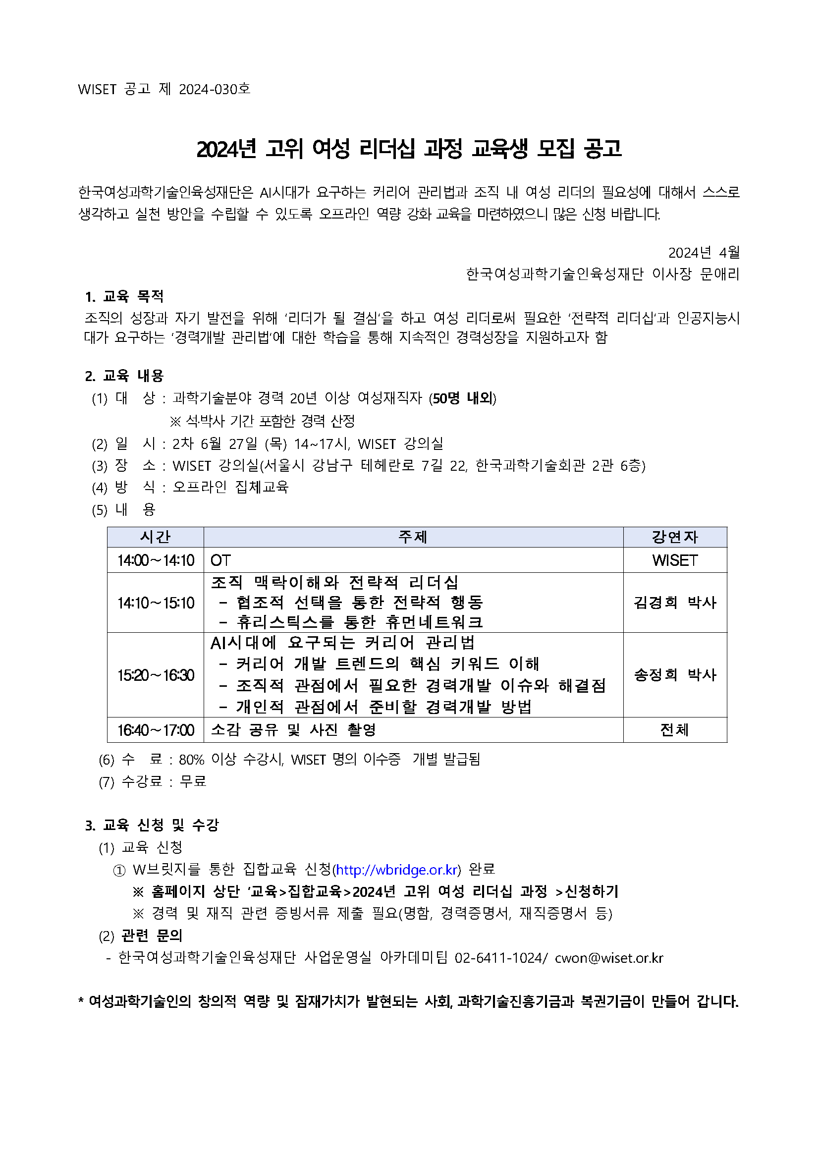 [WISET] 2024년 고위 여성 리더십 과정 2차 모집 공고 작성자 : 대한환경공학회 작성일 : 2024-06-18 조회수 : 292 2024년 고위 여성 리더십 과정 2차 모집 공고 (wiset 0412).pdf (다운로드 : 49회) 2024년 고위 여성 리더십 과정 2차 웹자보.png (다운로드 : 53회) 목록
