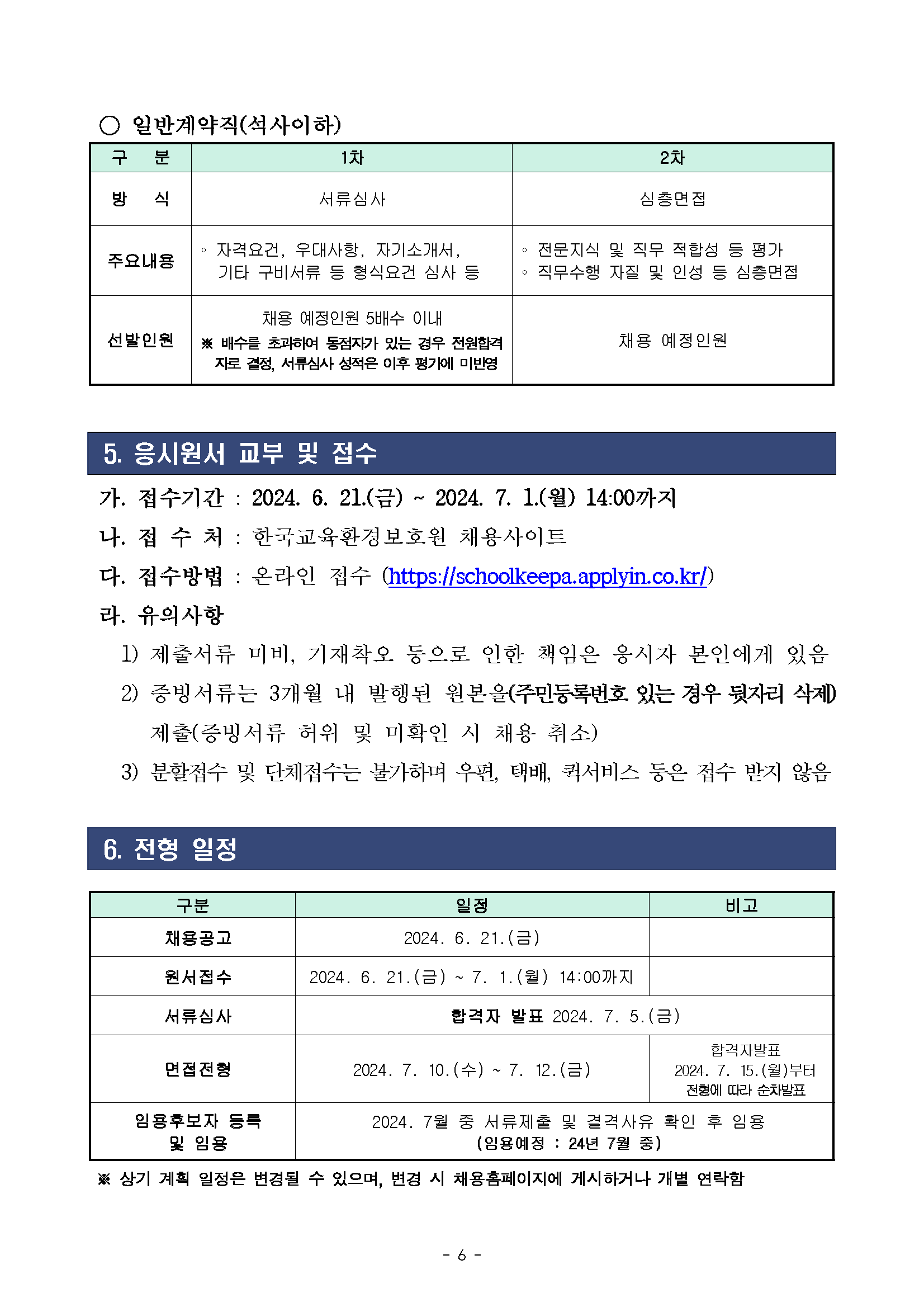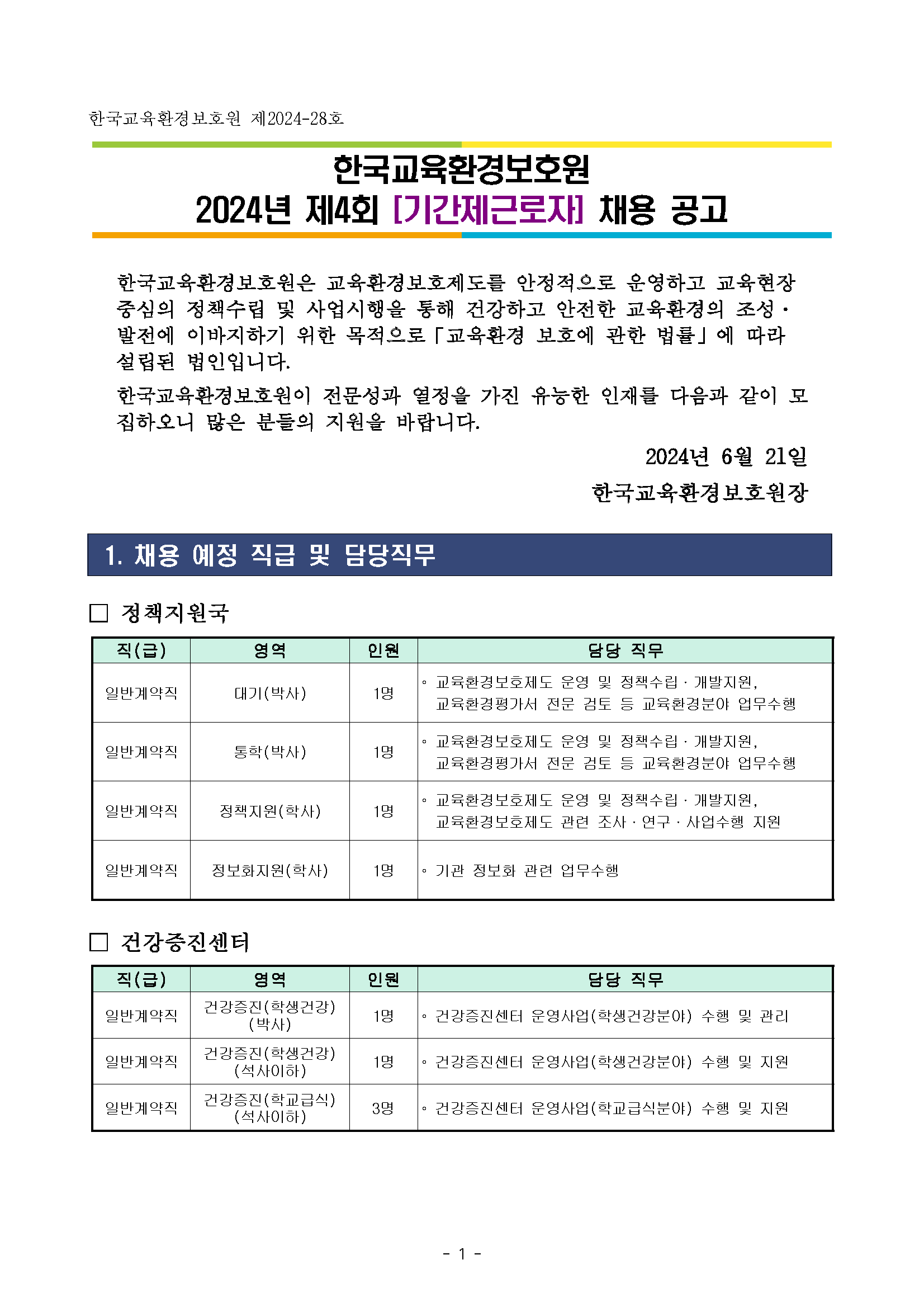 [한국교육환경보호원] 기관 인재채용 홍보 요청(2024. 6. 21.자 채용 공고) 작성자 : 대한환경공학회 작성일 : 2024-06-21 조회수 : 154 (2024. 6. 21.) 2024년 제4회 기간제 채용 공고문 등.hwp (다운로드 : 51회) (2024. 6. 21.) 2024년 제4회 기간제 채용 공고문 등.pdf (다운로드 : 47회) 목록