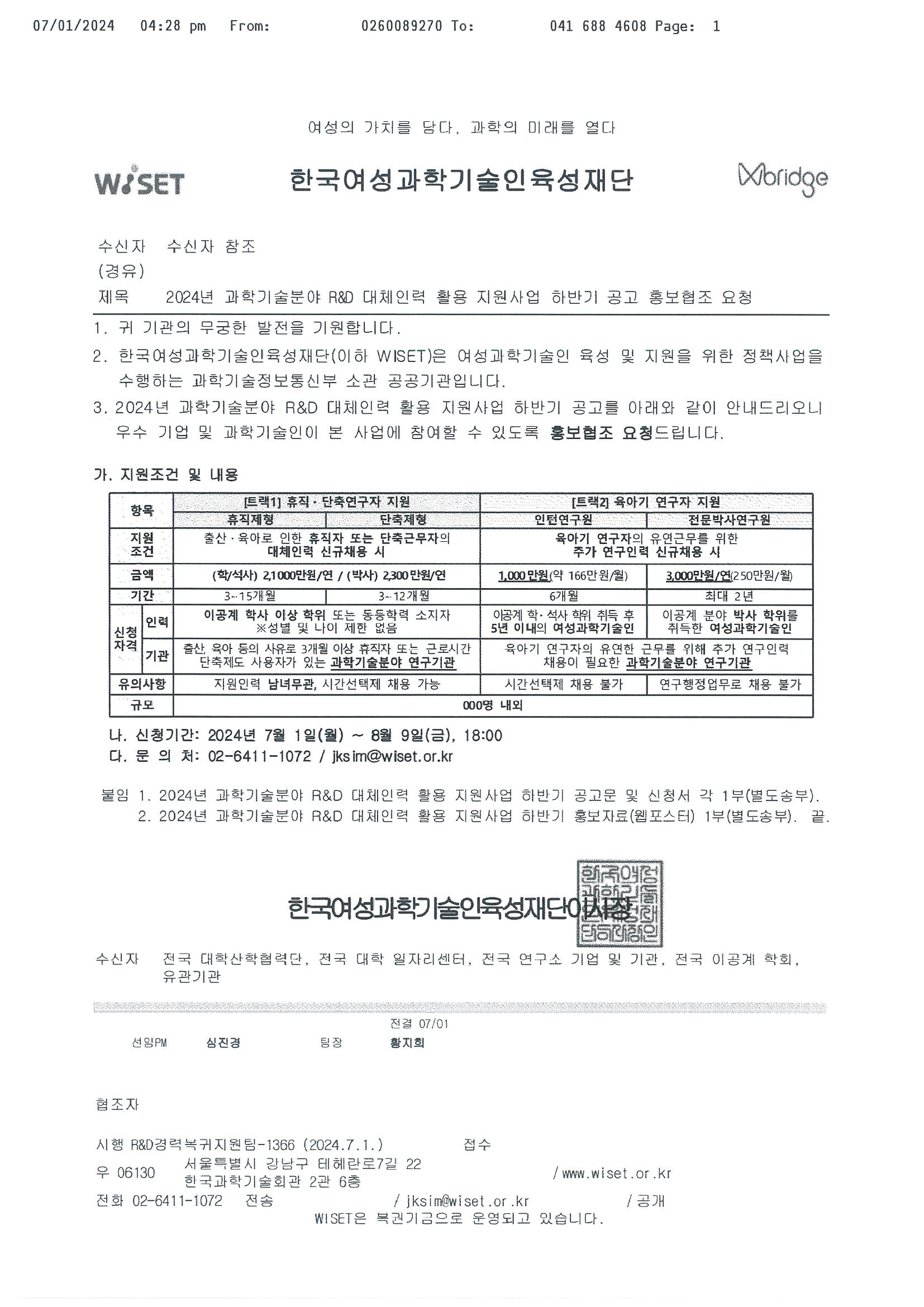 [WISET] 2024년 과학기술분야 R&D 대체인력 활용 지원사업 하반기 공고 안내 작성자 : 대한환경공학회 작성일 : 2024-07-02 조회수 : 242 (한국과학기술인육성재단) 2024년 과학기술분야 R&D 대체인력 활용 지원사업 하반기 공고.pdf (다운로드 : 57회) 목록
