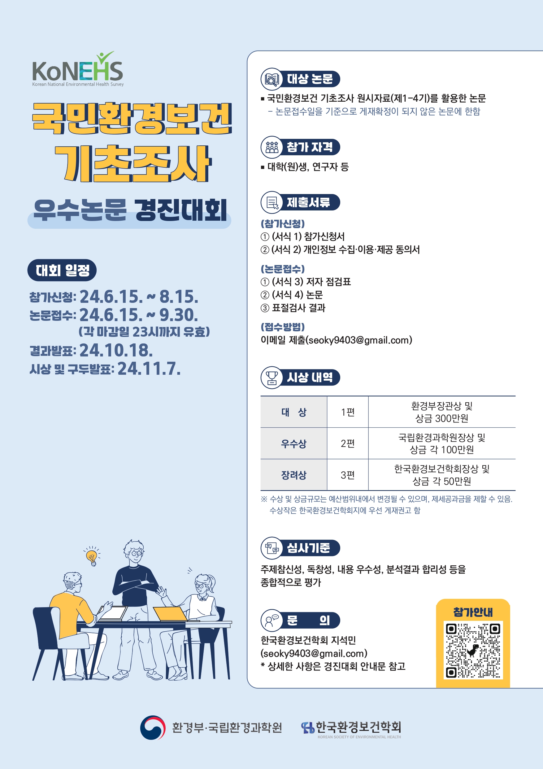 한국환경보건학회에서는 환경부·국립환경과학원과 공동으로, 국민환경보건기초조사 활용성 증대를 위한 경진대회를 개최할 예정입니다.