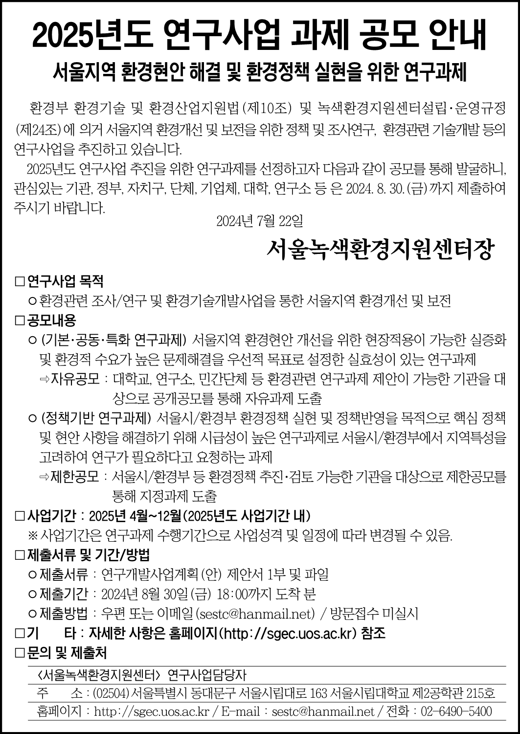 [서울녹색환경지원센터] 2025년도 환경현안 해결 및 환경정책 실현 연구과제 공모 안내 작성자 : 대한환경공학회 작성일 : 2024-07-23 조회수 : 321 자세한 사항은 아래 링크 확인하시기 바랍니다.기본자유특화 연구과제 ☞ https://sgec.uos.ac.kr/kor/board/notice.php?m=v&idx=1630정책기반 연구과제 ☞ https://sgec.uos.ac.kr/kor/board/notice.php?m=v&idx=1624&pNo=1 2025년도 연구개발사업계획(안)제안서 정책기반.hwp (다운로드 : 46회) 연구개발사업계획(안)제안서 기본자유특화.hwp (다운로드 : 46회) 목록