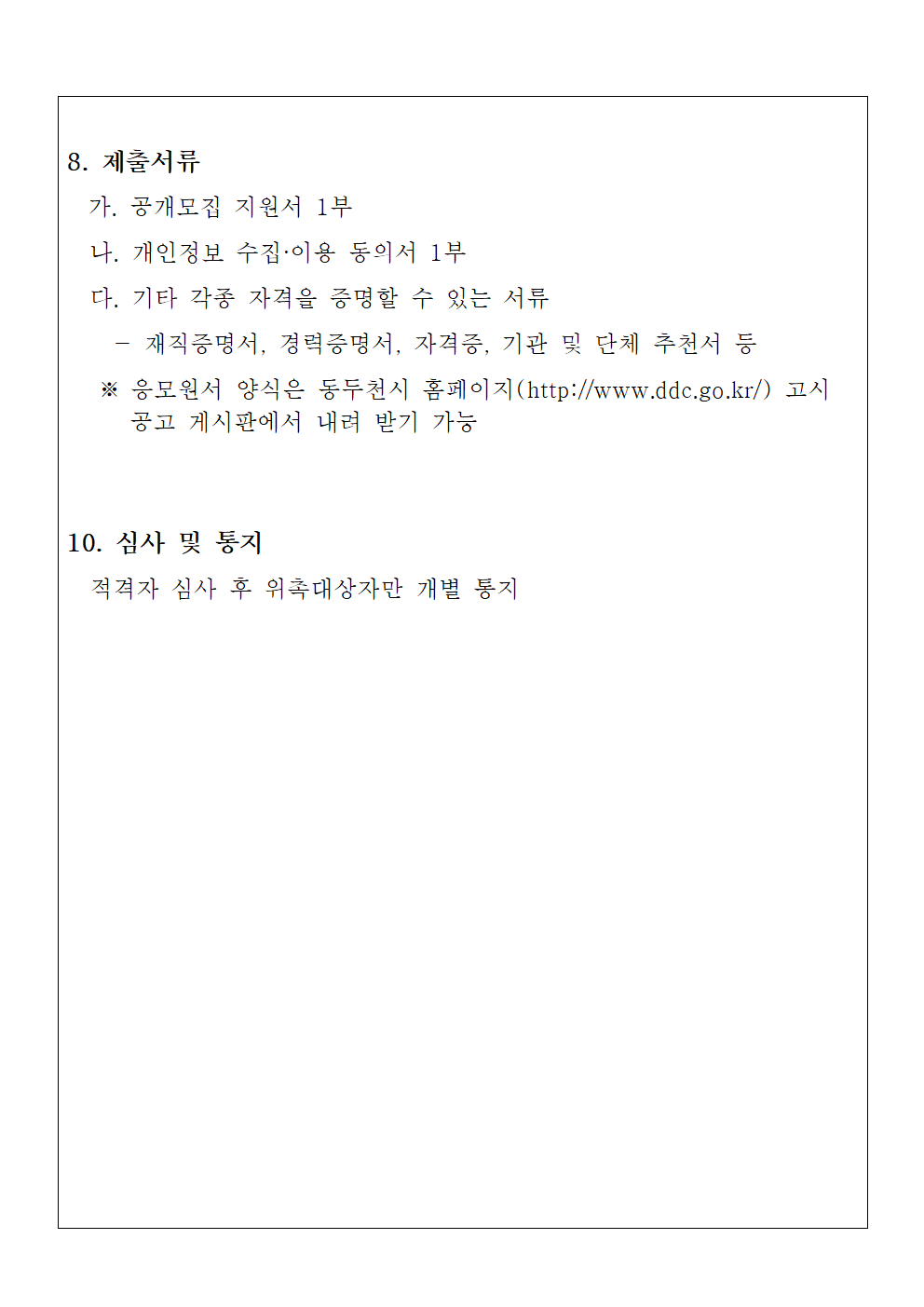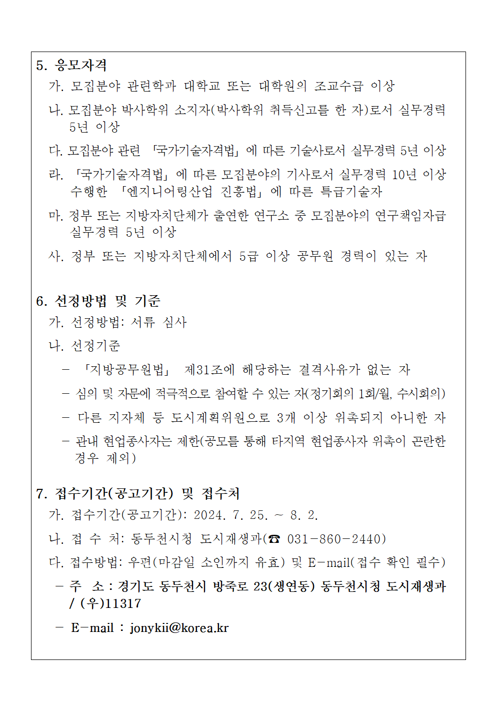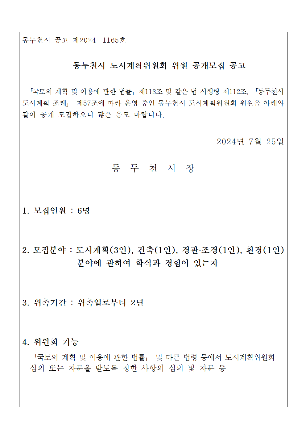 [동두천시 도시계획위원회] 위원 공개모집 작성자 : 대한환경공학회 작성일 : 2024-07-25 조회수 : 314 [본문] 동두천시 도시계획위원회 위원 공개모집 알림.pdf (다운로드 : 65회) [붙임1] 공개모집 공고문(동두천시 공고 제2024 1165호).hwp (다운로드 : 54회) [붙임2] 도시계획위원회 지원서 및 개인정보수집이용 동의서(서식).hwp (다운로드 : 51회) 목록