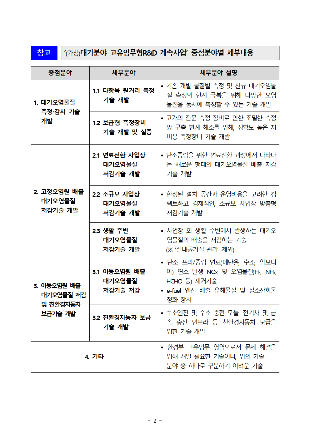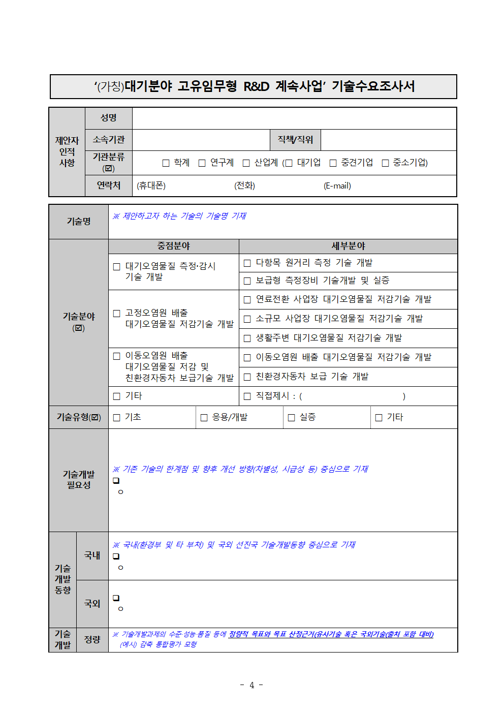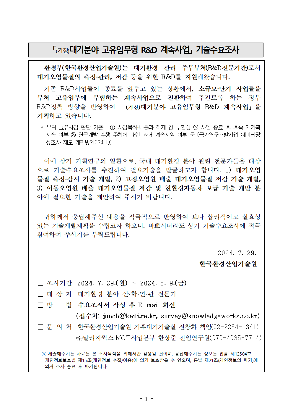 [한국환경산업기술원]대기분야 부처 고유임무형 계속 R&D사업 기술수요조사[~8.9(금)] 작성자 : 대한환경공학회 작성일 : 2024-07-30 조회수 : 276 대기분야 부처 고유임무형 계속 R&D사업(가칭) 기술수요조사 참여 및 홍보 협조 요청.pdf (다운로드 : 60회) [붙임] (양식) 대기분야 고유임무형 계속 R&D사업_기술수요조사서.hwp (다운로드 : 50회) [참고] 통합기획 대상 기존사업 범위.hwp (다운로드 : 68회) 목록
