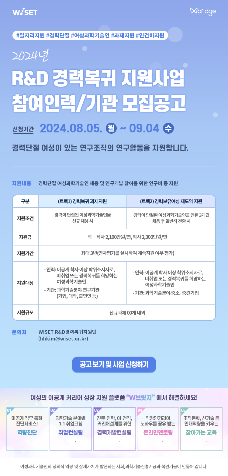WISET 2024년 여성과학기술인 R&D 경력복귀 지원사업 하반기 모집 공고
