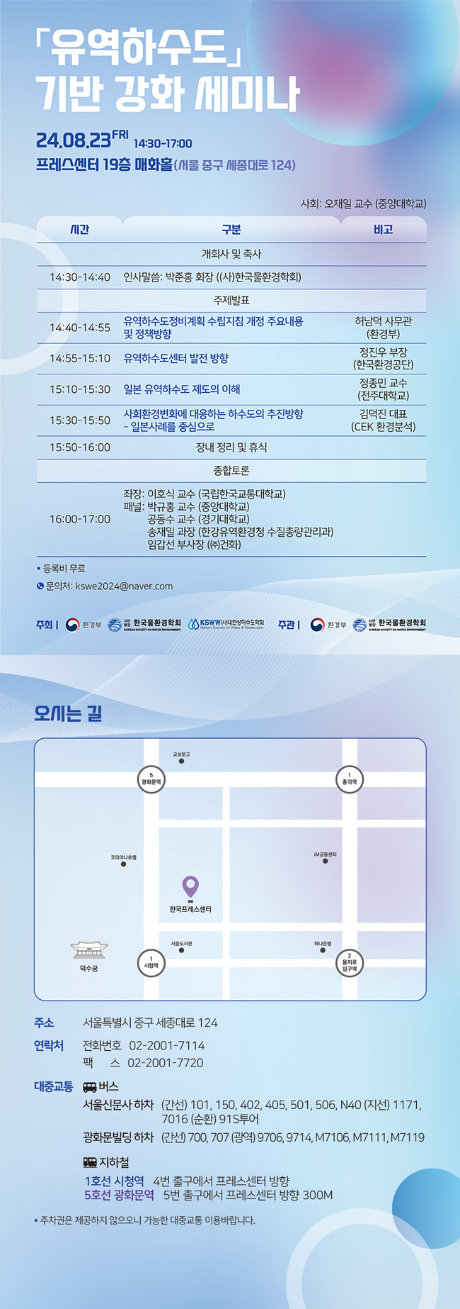 [한국물환경학회]유역하수도 기반 강화 세미나 개최 안내 작성자 : 대한환경공학회 작성일 : 2024-08-06 조회수 : 302 유역하수도 기반 강화 세미나 개최 안내.pdf (다운로드 : 53회) [한국물환경학회공문]유역하수도 기반 강화 세미나 홍보 요청.pdf (다운로드 : 65회) 목록
