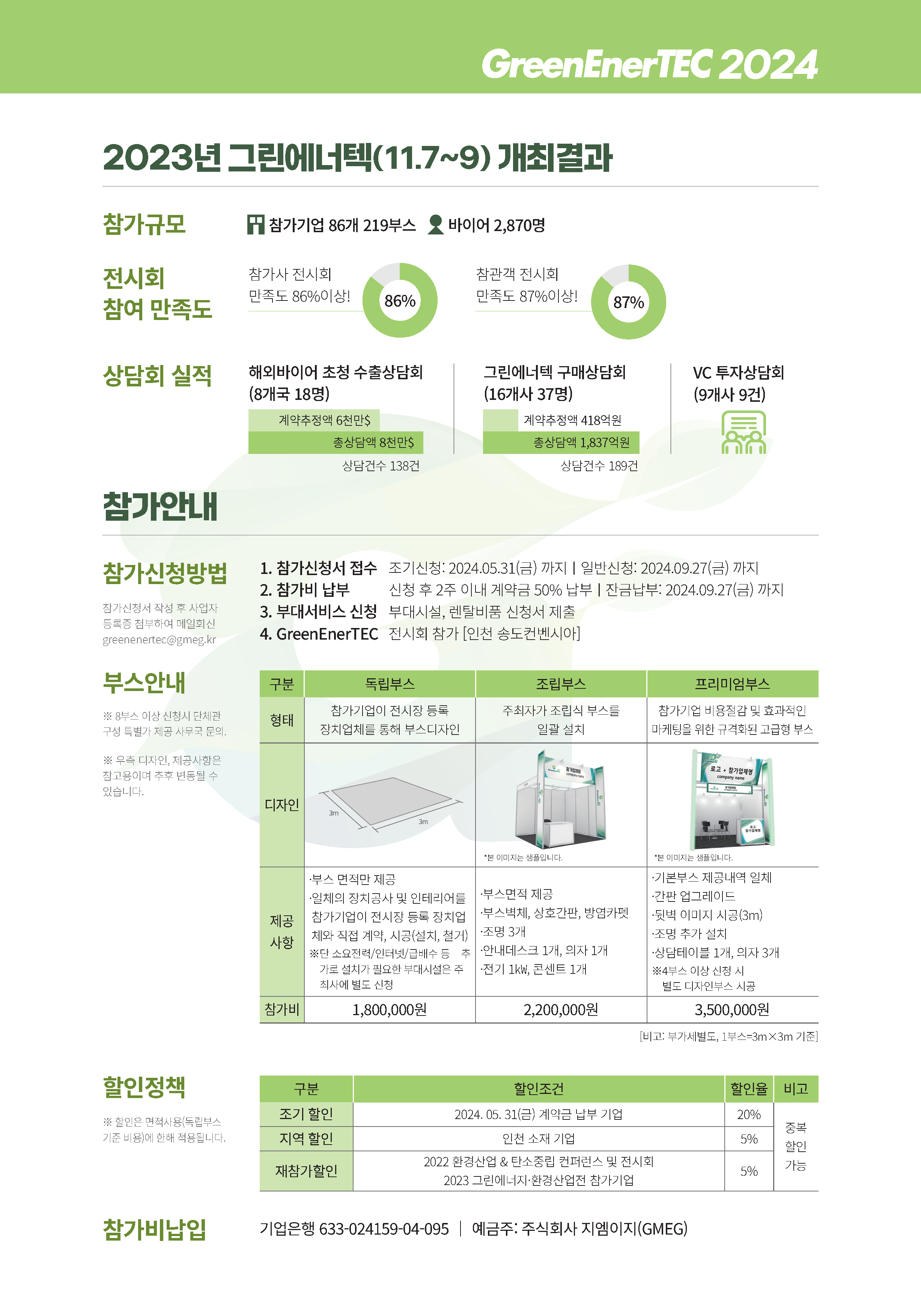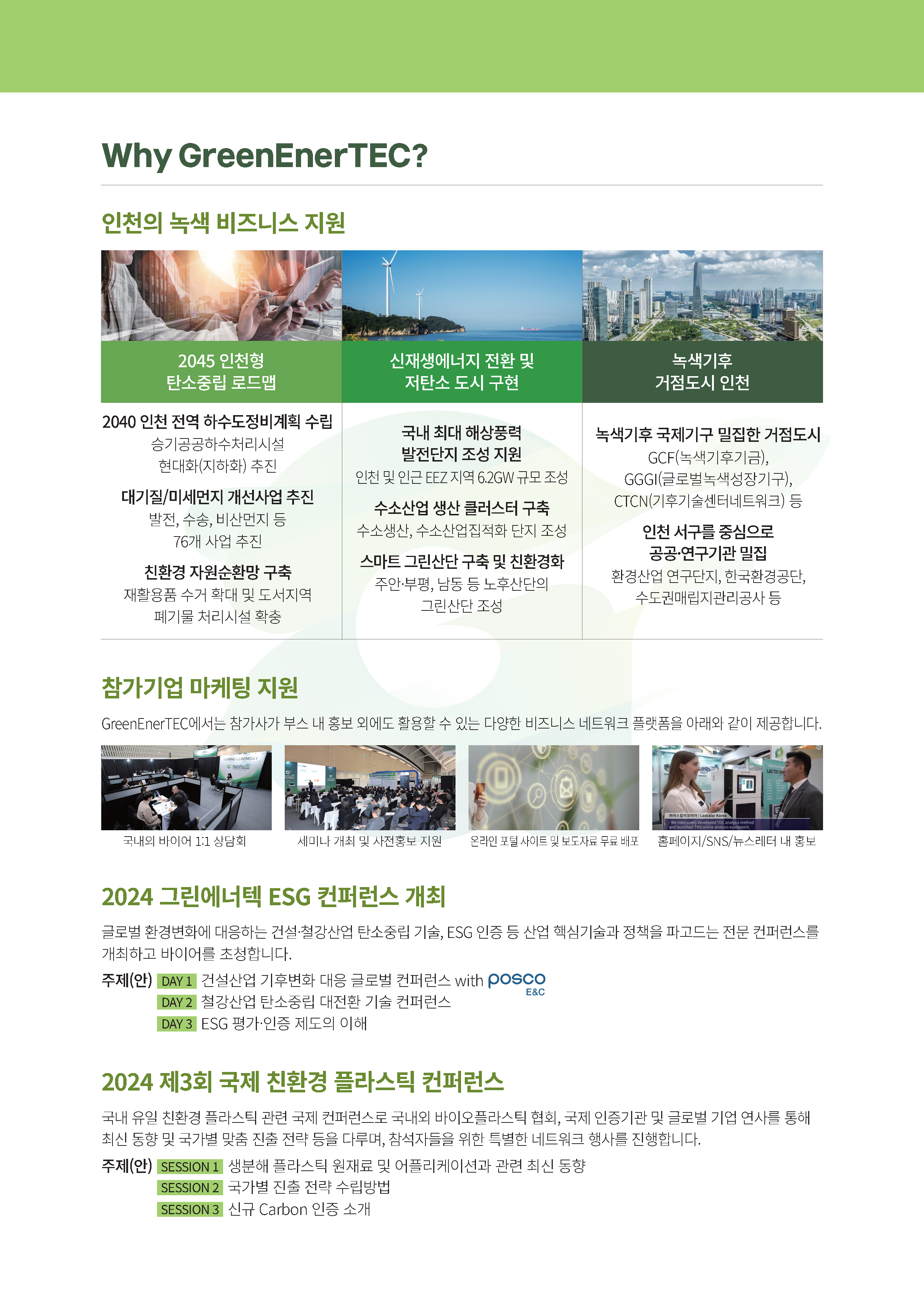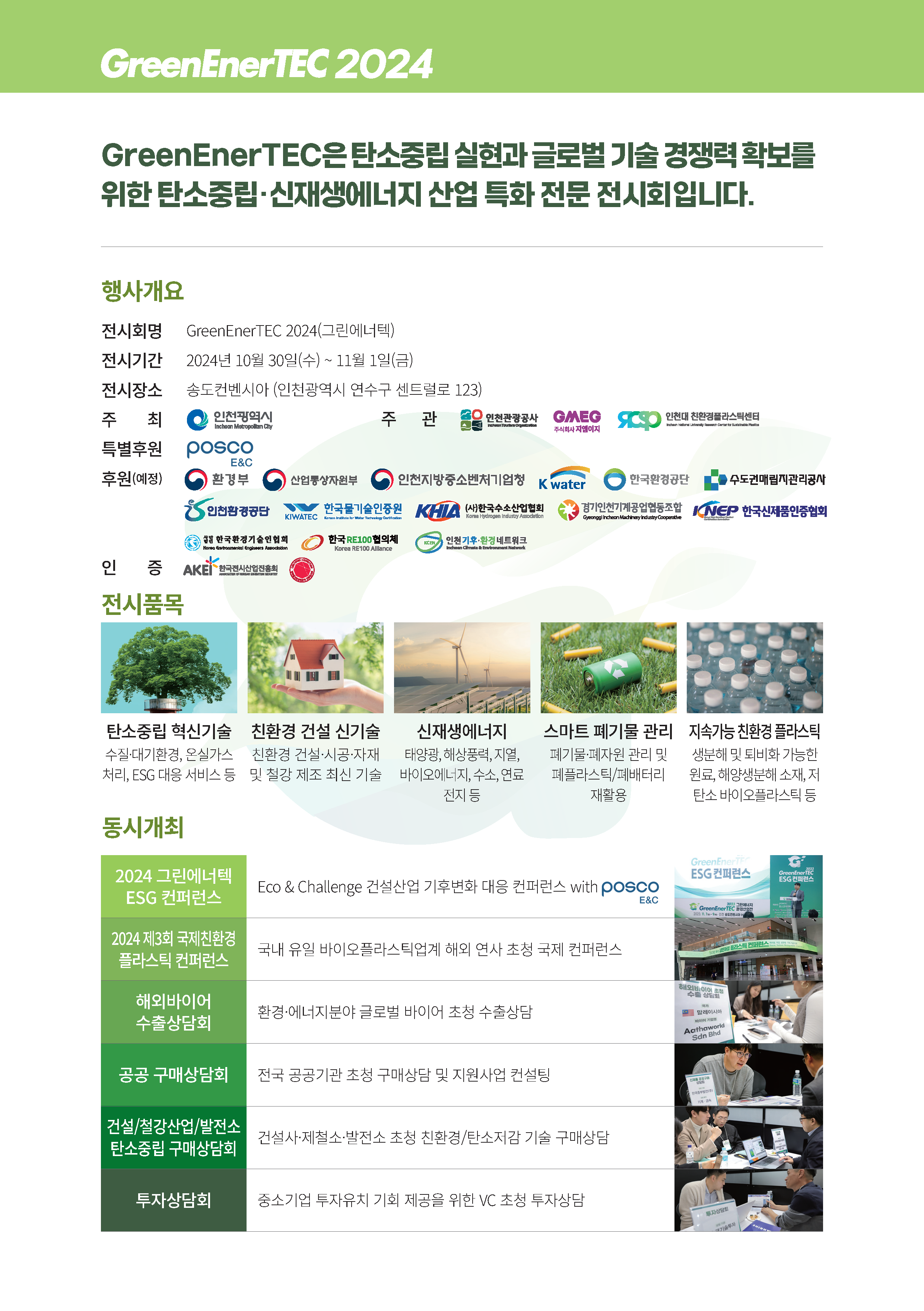 [GreenEnerTEC] GreenEnerTEC 2024 작성자 : 대한환경공학회 작성일 : 2024-08-07 조회수 : 294 GreenEnerTec2024_참가신청서.xlsx (다운로드 : 48회) (공문) 「2024 그린에너텍」전시회 개최안내 및 참여요청.pdf (다운로드 : 57회) GreenEnerTEC_제안서.pdf (다운로드 : 49회) 2024 GreenEnerTEC Brochure_Kor_Final.pdf (다운로드 : 57회) 목록