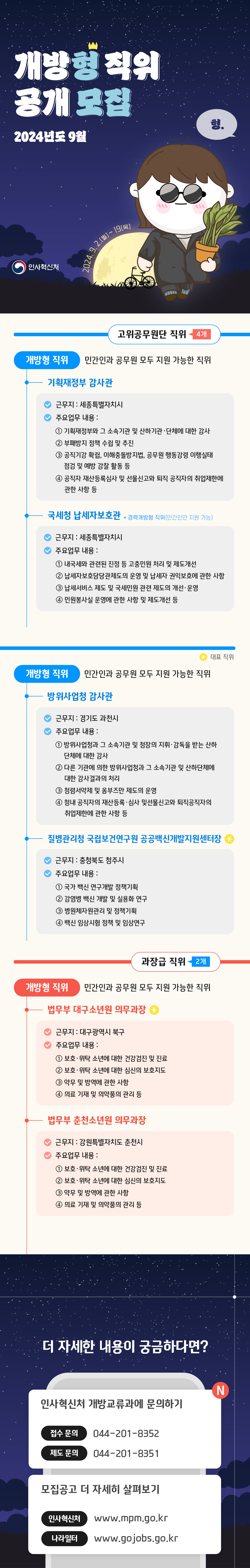 [인사혁신처 중앙선발시험위원회] 2024년9월 고공단 및 과장급 개방형 직위 선발 안내 작성자 : 대한환경공학회 작성일 : 2024-09-03 조회수 : 203 1. 2024년 9월 개방형 직위 공개모집 안내.zip (다운로드 : 50회) 2. 2024년 9월 개방형 직위 공고문.zip (다운로드 : 51회) 3. 2024년 9월 개방형 직위 직위안내자료.zip (다운로드 : 52회) 9월 개방형 직위 모집공고 한컷파일.zip (다운로드 : 51회) 목록