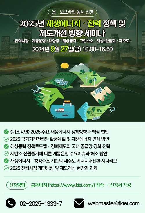 [산업교육연구소] 2025년 재생에너지ㆍ전력 정책 및 제도개선 방향 세미나 개최 안내 작성자 : 대한환경공학회 작성일 : 2024-09-05 조회수 : 361 산업교육연구소 2025년 재생에너지ㆍ전력 정책 및 제도개선 방향 세미나 개최 안내 산업교육연구소는 각 산업분야별 기술 및 시장동향과 기업체 사업전략 등을 조사분석하여기업 및 기관들에게 아이디어 획득과 경쟁력 있는 전략수립에 도움을 드리는 세미나 전문회사입니다.오는 2024년 9월 27일(금) “2025년 재생에너지ㆍ전력 정책 및 제도개선 방향 세미나”를 개최합니다. 25_포스터.jpg (다운로드 : 64회) 목록