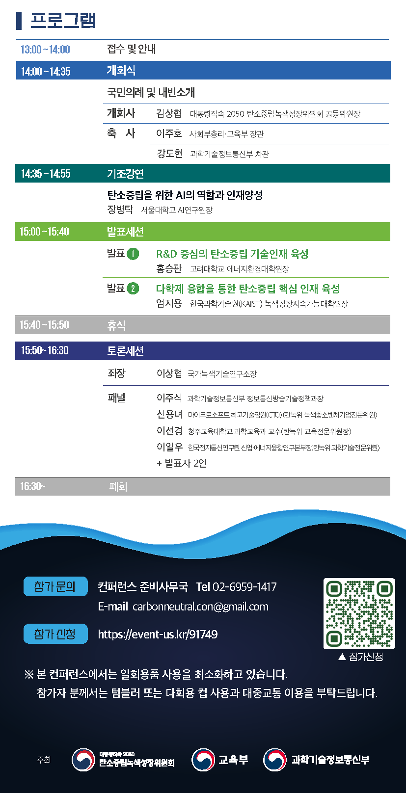 [탄소중립녹색성장위원회] AI기반 그린융합인재 강국 코리아 컨퍼런스 개최 안내 작성자 : 대한환경공학회 작성일 : 2024-10-11 조회수 : 155 그린융합인재_웹초청장(1008).pdf (다운로드 : 59회) 목록