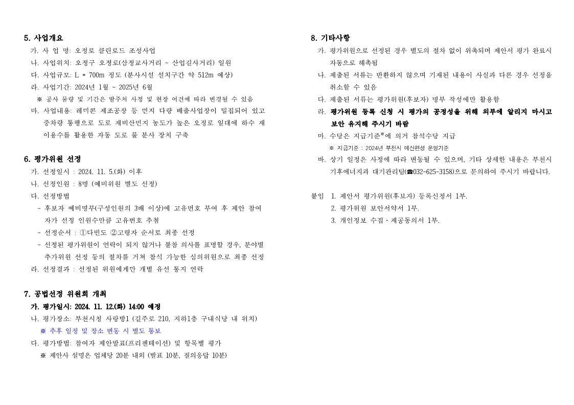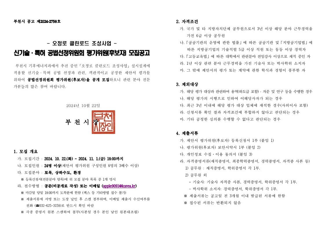 [부천시]「오정로 클린로드 조성사업」신기술·특허 공법선정위원회 평가위원(후보자) 공개모집 알림 작성자 : 대한환경공학회 작성일 : 2024-10-22 조회수 : 203 [본문] 「오정로 클린로드 조성사업」신기술·특허 공법선정위원회 평가위원(후보자) 공개모집 알림.pdf (다운로드 : 76회) 공법선정평가위원(후보자) 공개모집 공고문(오정로 클린로드 조성사업).hwp (다운로드 : 67회) 목록