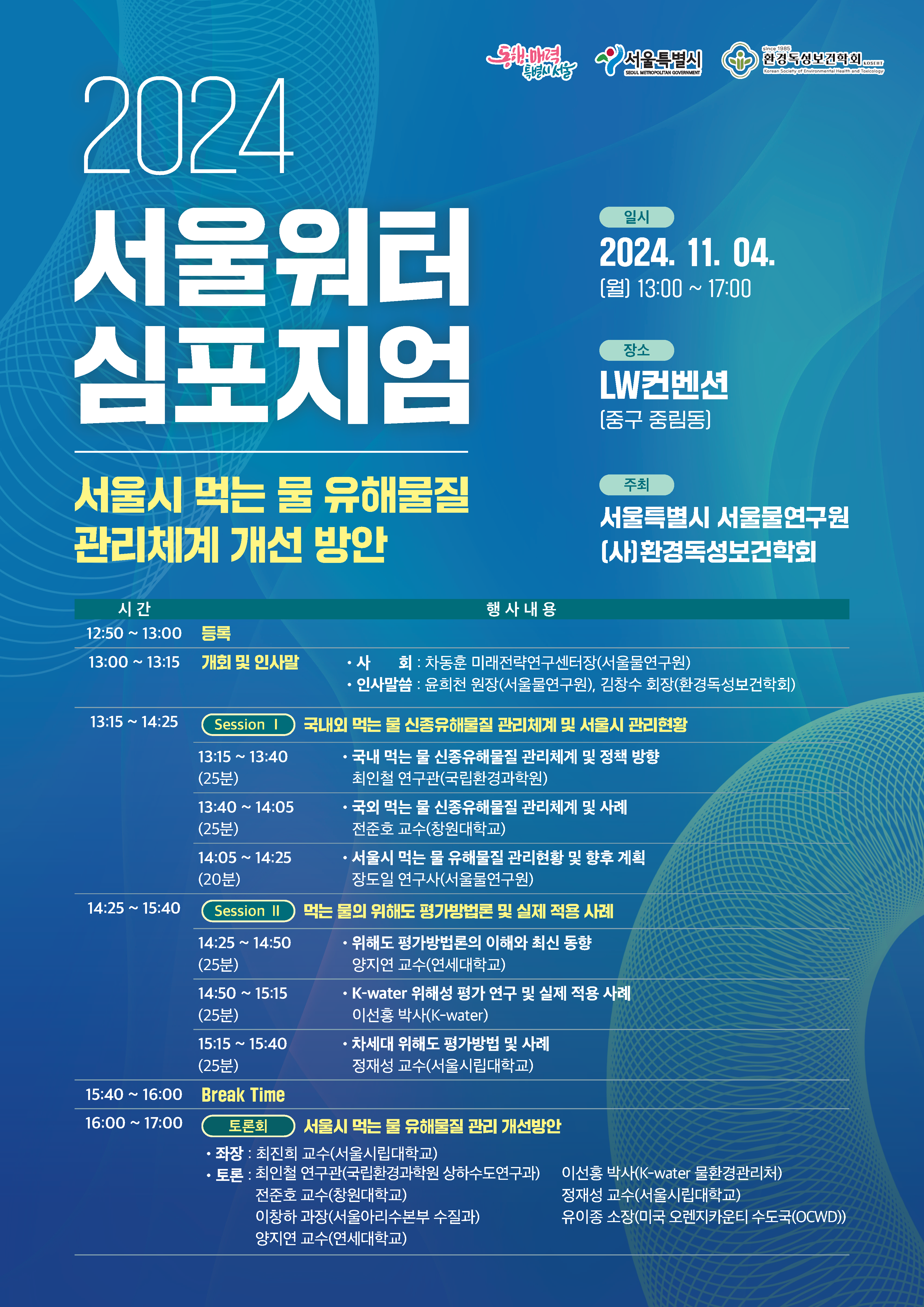 [서울물연구원] 2024 서울워터심포지엄『서울시 먹는 물 유해물질 관리체계 개선 방안』 개최 안내 작성자 : 대한환경공학회 작성일 : 2024-10-22 조회수 : 214 2024 서울워터 심포지엄 웹포스터_.pdf (다운로드 : 84회) 목록