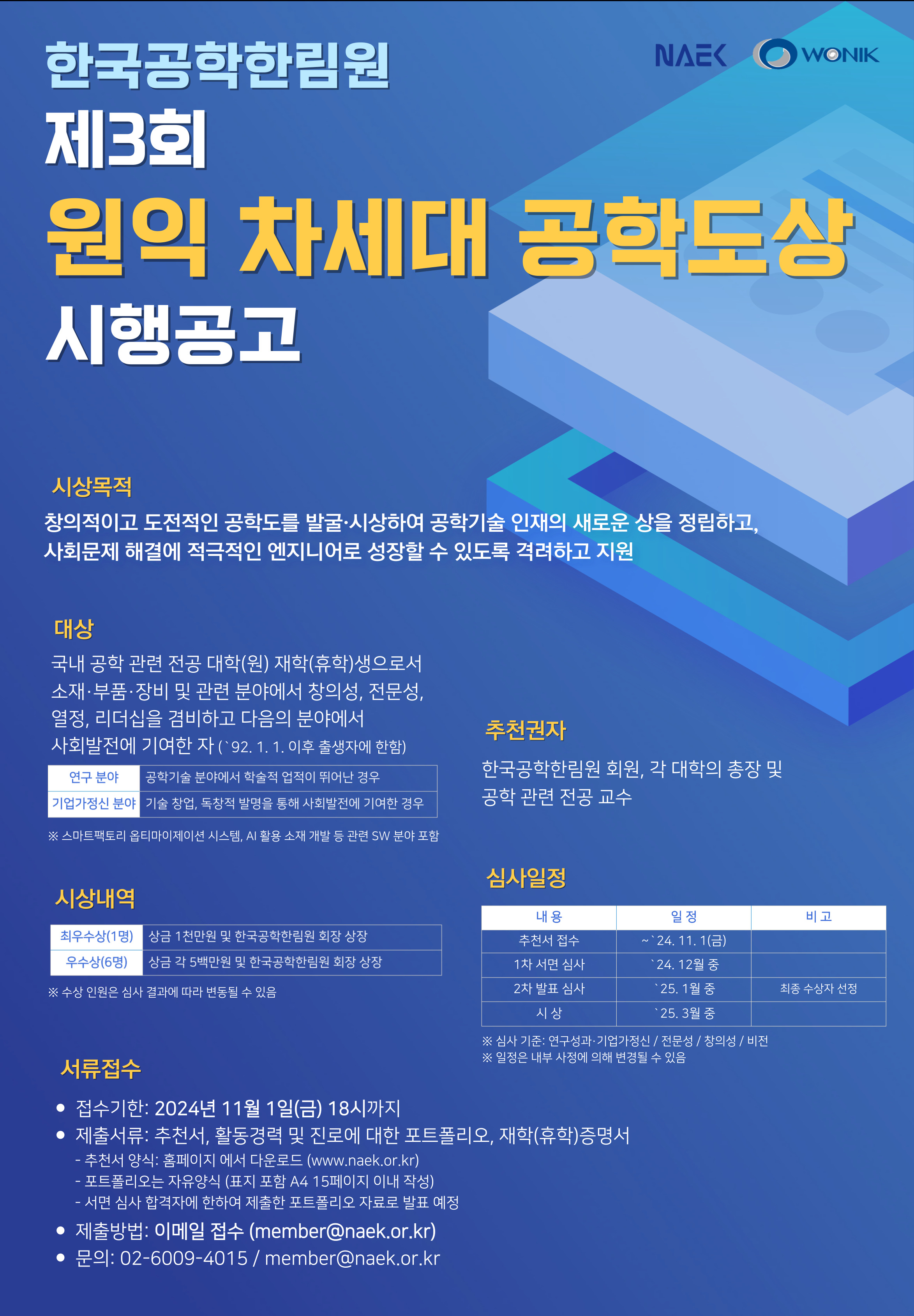 [한국공학한림원] 제3회 원익 차세대 공학도상 공고 안내 (~11/1(금)) 작성자 : 대한환경공학회 작성일 : 2024-10-22 조회수 : 314 [한국공학한림원] 제3회 원익 차세대 공학도상 공고 안내- 대상 : 국내 공학 관련 전공 대학(원) 재학(휴학)생으로서소재·부품·장비 및 관련 분야에서 기술 창업, 독창적 발명을 통해사회발전에 기여한 자 (`92. 1. 1 이후 출생자) * 연구 분야/ 기업가정신 분야 * 미졸업 수료생까지 지원 가능- 시상 내용 : 최우수상 1명(1,000만원), 우수상 6명(각 500만원) * 한국공학한림원 회장 상장 및 상금- 공고 링크 : 한국공학한림원 (naek.or.kr) 원익 차세대 공학도상 추천서_2024_(후보 성명).hwp (다운로드 : 122회) 제3회 원익 차세대 공학도상 시행안내.pdf (다운로드 : 130회) 3회 원익_포스터.jpg (다운로드 : 146회) 목록