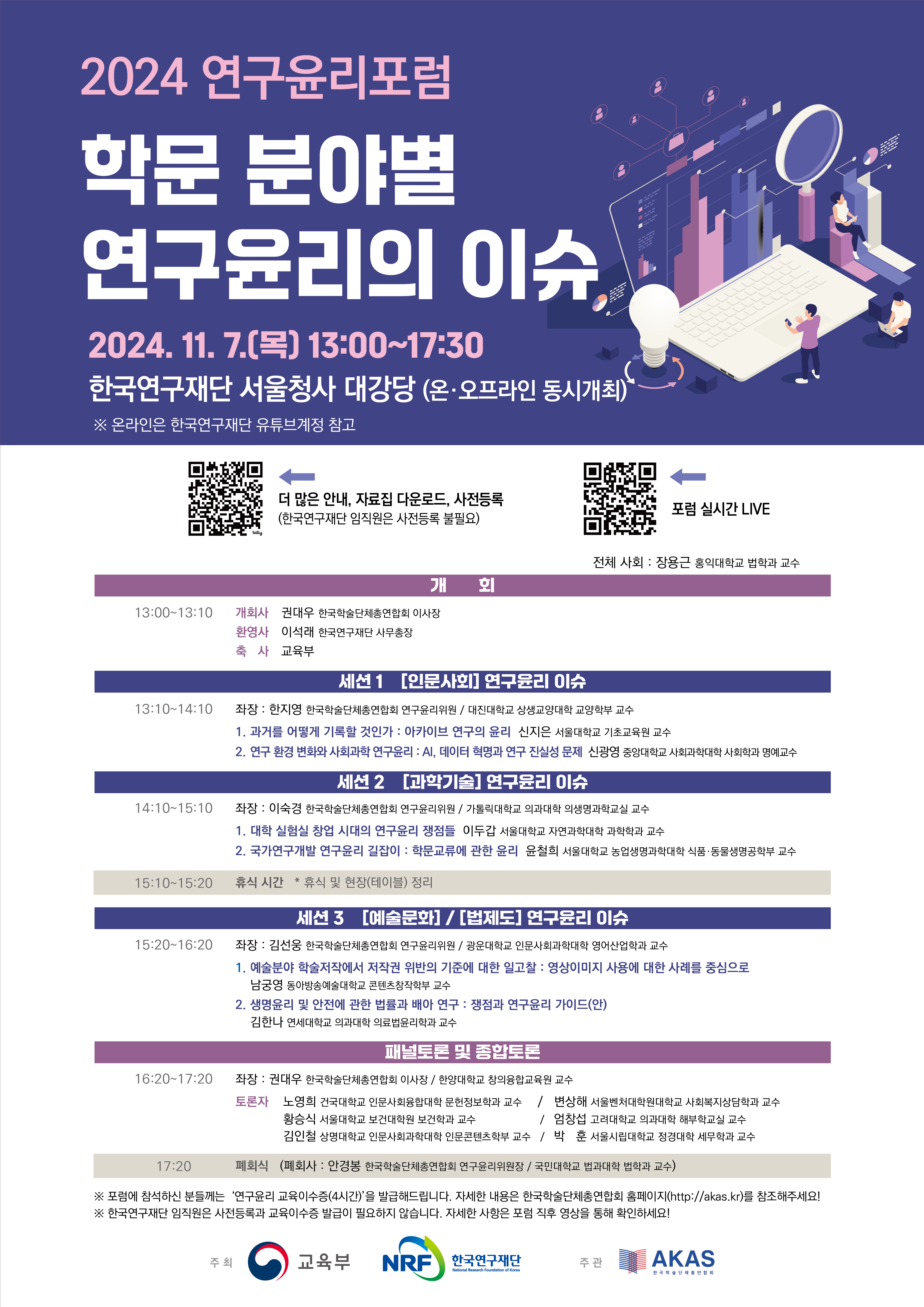 [한국연구재단] 2024년 연구윤리포럼 개최 안내(11.7.(목)) 작성자 : 대한환경공학회 작성일 : 2024-10-24 조회수 : 173 [한국연구재단] 2024년 연구윤리포럼 개최 안내 ○ 일시: 2024. 11. 7.(목) 13:00~17:30○ 방법: (온라인) NRF 유튜브 생중계 / (오프라인) 한국연구재단 서울청사 대강당○ 교육학점: "연구윤리 교육이수증" 4시간 제공○ 문의처: (사)한국학술단체총연합회※ Email: kaoas101@gmail.com, 전화 : 02)3461-5660 [공문] 2024년 연구윤리 포럼 개최 안내.pdf (다운로드 : 52회) 붙임. 2024년 연구윤리포럼 포스터.pdf (다운로드 : 55회) 목록