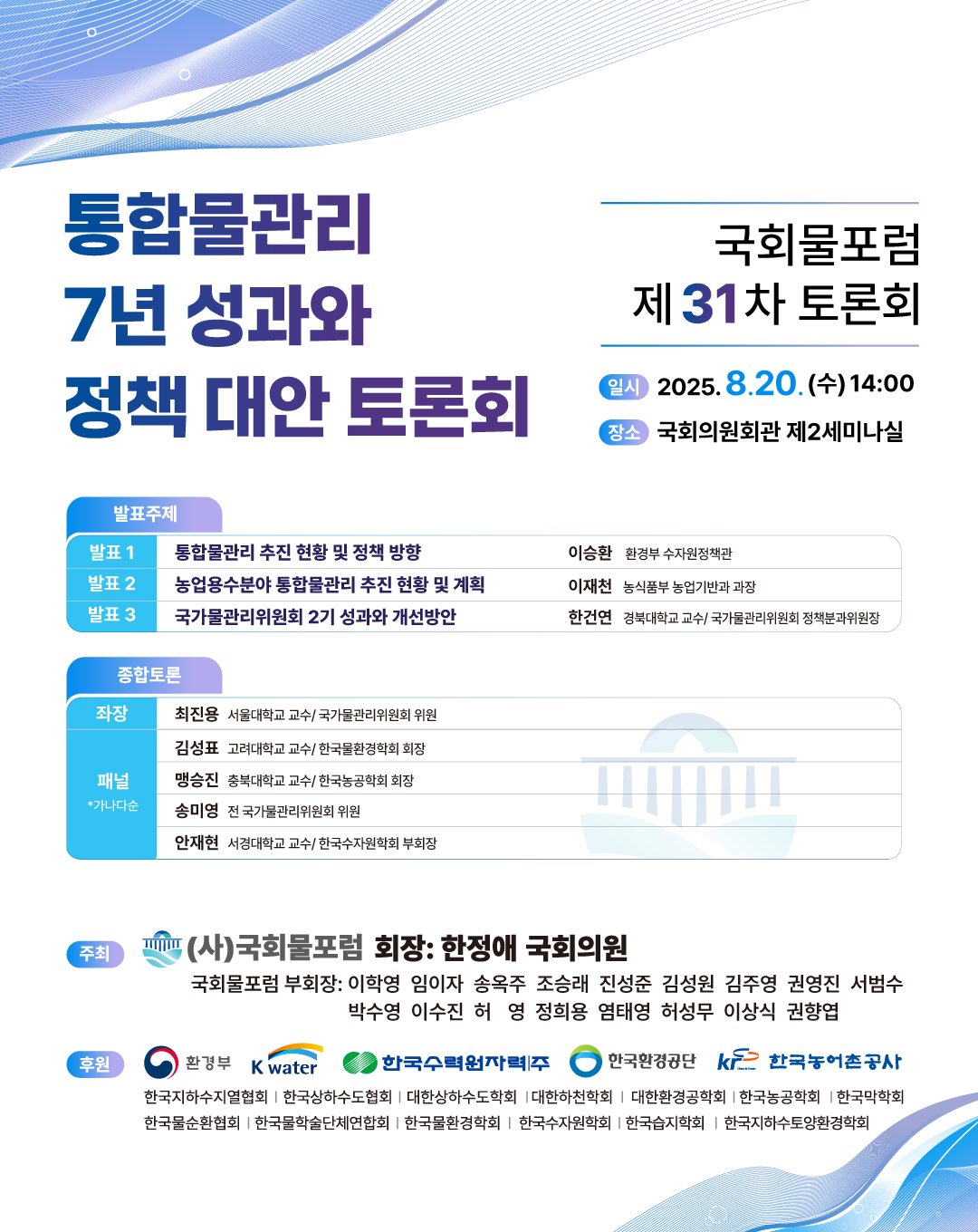 [국회물포럼] 제31차 토론회 "통합물관리 7년 성과와 정책 대안 토론" 개최 안내 작성자 : 대한환경공학회 작성일 : 2025-08-13 조회수 : 253 붙임1.국회물포럼 제31차 토론회 계획안 1 .pdf (다운로드 : 170회) 붙임2.국회물포럼 제31차 토론회 포스터.jpg (다운로드 : 160회) 목록