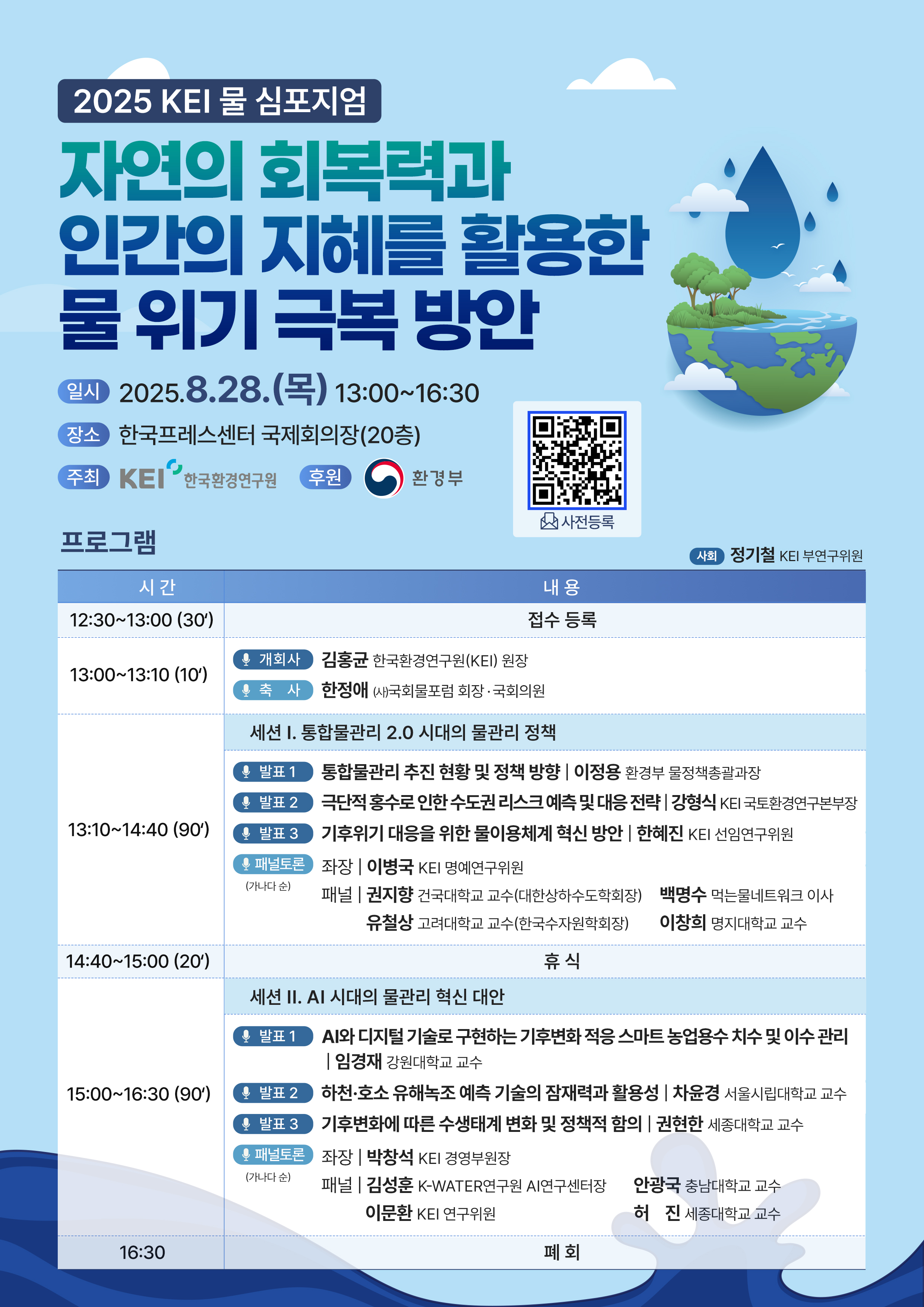 [한국환경연구원] 2025 KEI 물 심포지엄(자연의 회복력과 인간의 지혜를 활용한 물 위기 극복 방안)개최 안내 작성자 : 대한환경공학회 작성일 : 2025-08-14 조회수 : 276 2025 KEI 물 심포지엄.jpg (다운로드 : 165회) 목록