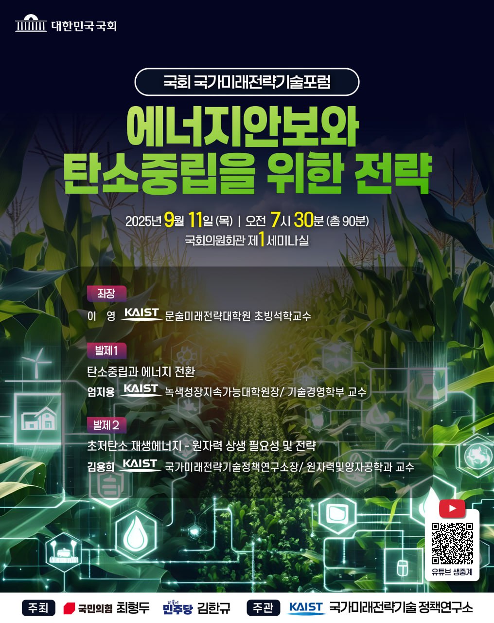 [KAIST] 국회 국가미래전략기술포럼(에너지안보와 탄소중립을 위한 전략)안내 작성자 : 대한환경공학회 작성일 : 2025-09-08 조회수 : 249 국회 국가미래전략기술포럼.jpg (다운로드 : 184회) 목록
