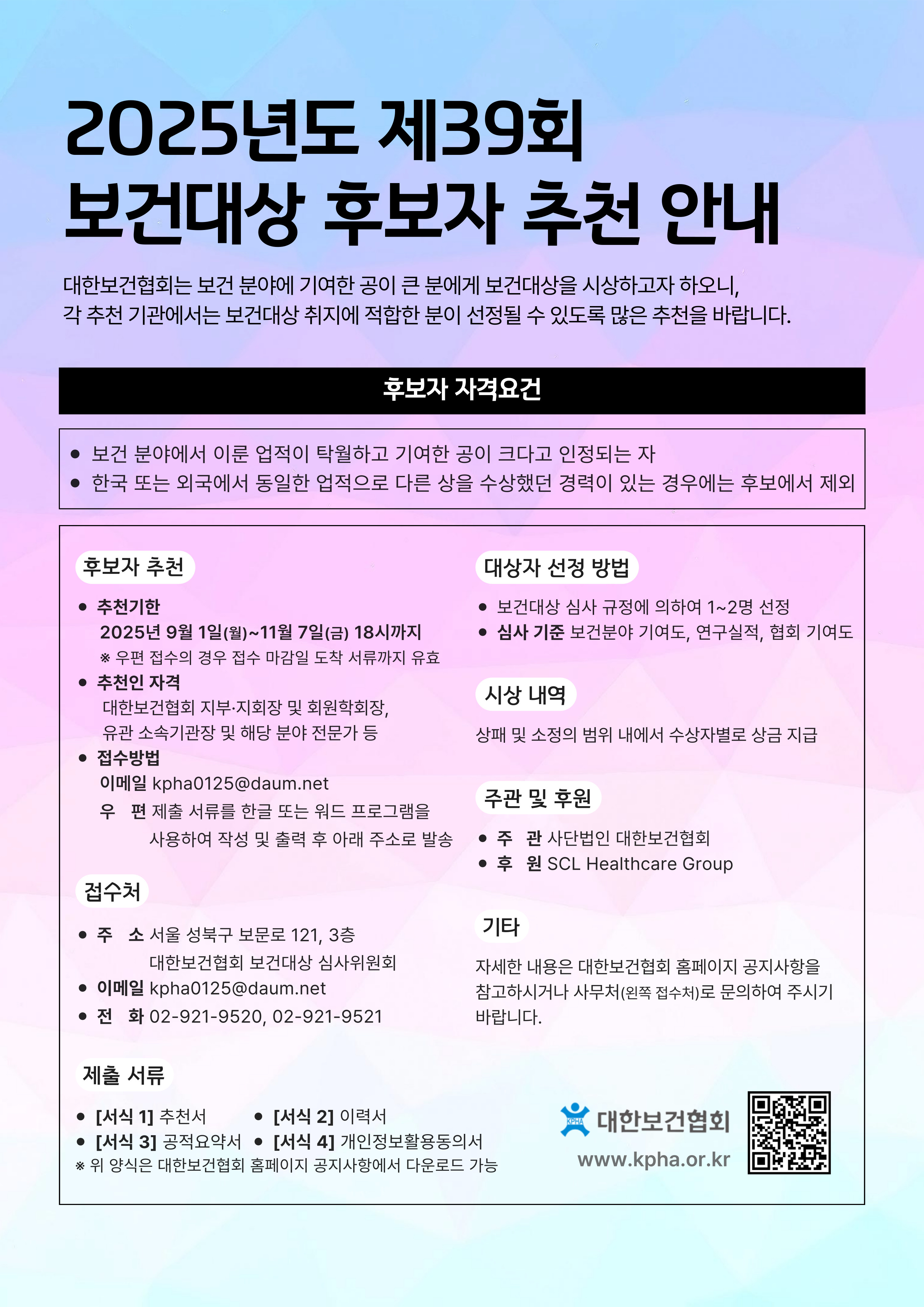 [대한보건협회] 제39회 보건대상 수상후보 추천 및 홍보의뢰(~11/7까지 접수) 작성자 : 대한환경공학회 작성일 : 2025-09-08 조회수 : 255 2025년도 제39회 보건대상 공고문.pdf (다운로드 : 201회) 2025년도 제39회 보건대상 제출서류 서식 4종.hwp (다운로드 : 185회) 2025년 제39회 보건대상 포스터.jpg (다운로드 : 190회) 목록