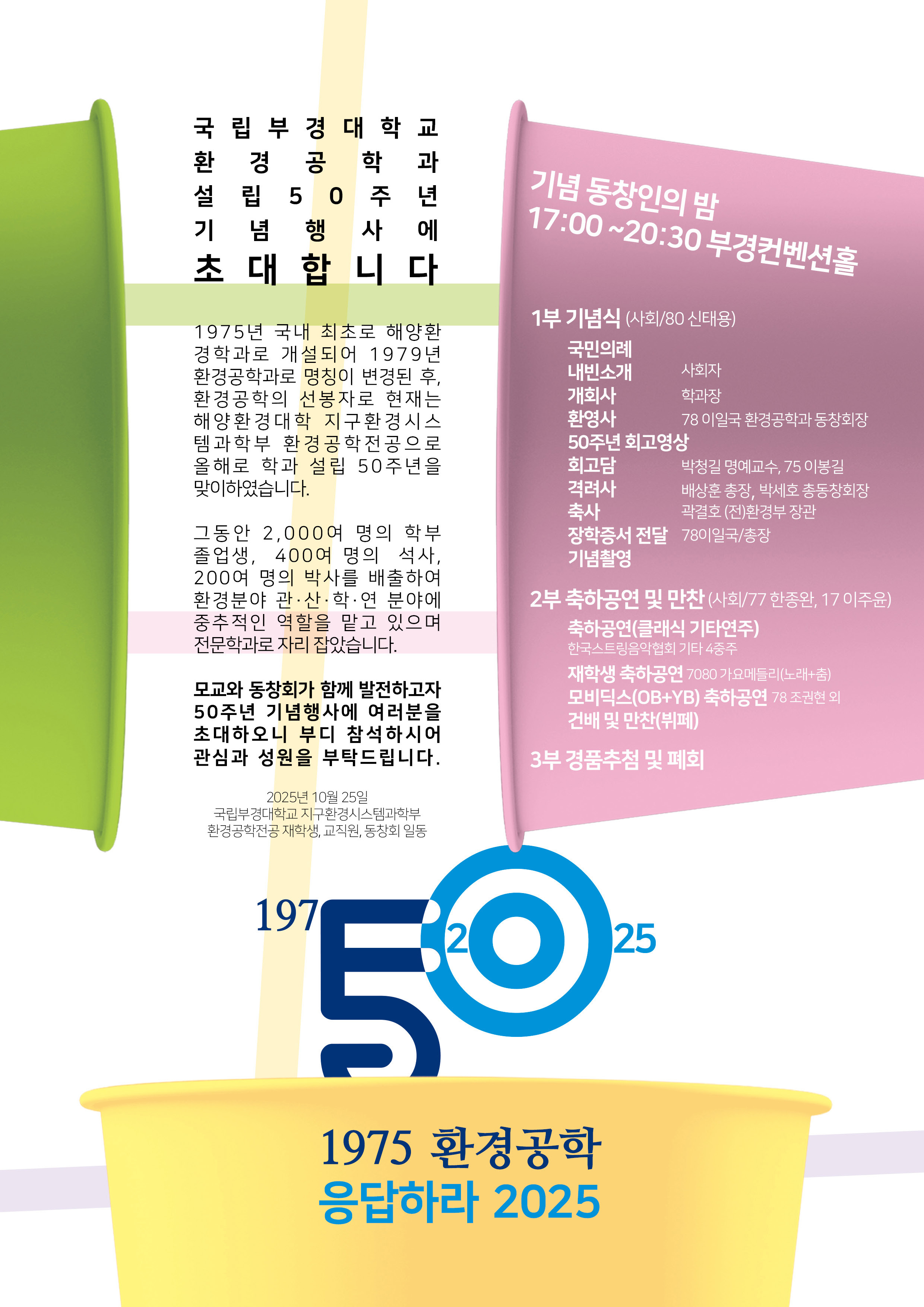 [부경대학교] 국립부경대학교 환경공학과 설립 50주년 기념 행사 안내 작성자 : 대한환경공학회 작성일 : 2025-10-01 조회수 : 27 팜플랫 공지용.pdf (다운로드 : 12회) 목록