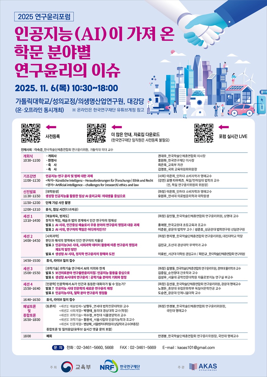 [한국연구재단] 2025년 연구윤리포럼 개최 안내(11.6.(목)) 작성자 : 대한환경공학회 작성일 : 2025-10-22 조회수 : 103 붙임1. 2025년 연구윤리포럼 포스터.jpg (다운로드 : 100회) 붙임2. 찾아오시는길.hwp (다운로드 : 92회) 목록
