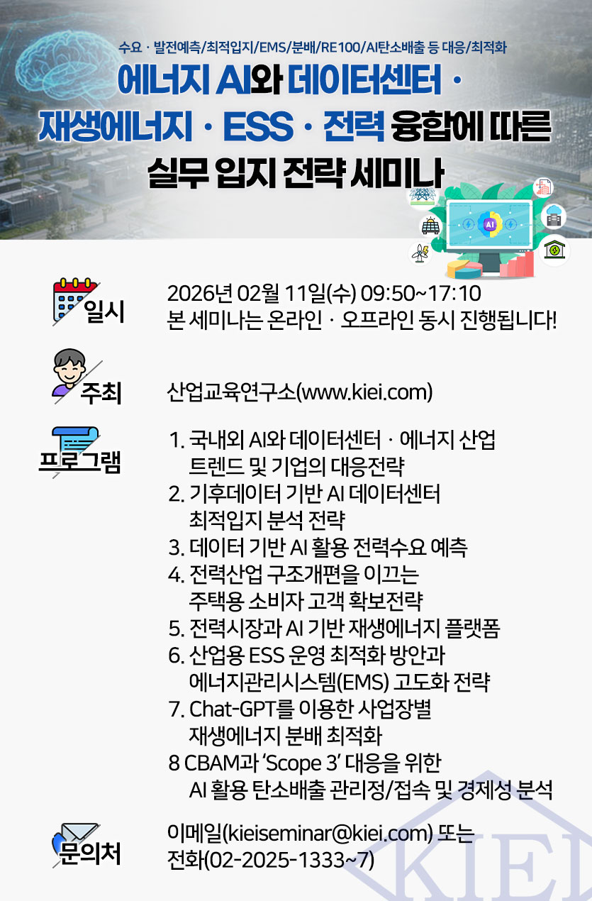 [산업교육연구소] 에너지 AI와 데이터센터ㆍ재생에너지ㆍESSㆍ전력 융합에 따른 실무 입지 전략 세미나 개최 안내 작성자 : 대한환경공학회 작성일 : 2026-02-04 조회수 : 53 20260211 에너지AI 세미나안내문.pdf (다운로드 : 24회) 20260211 에너지AI 세미나포스터.jpg (다운로드 : 21회) 목록