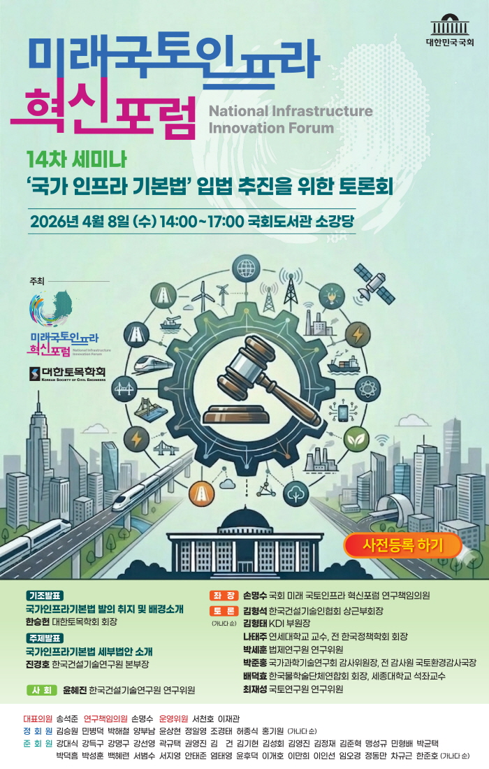 [대한토목학회] 미래 국토인프라 혁신포럼 14차 세미나-국가인프라기본법 입법 추진을 위한 토론회 개최 안내 작성자 : 대한환경공학회 작성일 : 2026-04-02 조회수 : 14 목록