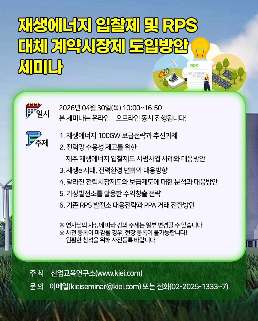 [산업교육연구소] 재생에너지 입찰제 및 RPS 대체 계약시장제 도입방안 세미나 개최 안내 작성자 : 대한환경공학회 작성일 : 2026-04-17 조회수 : 43 20260430세미나 안내문.pdf (다운로드 : 22회) 20260430세미나 포스터.jpg (다운로드 : 17회) 목록