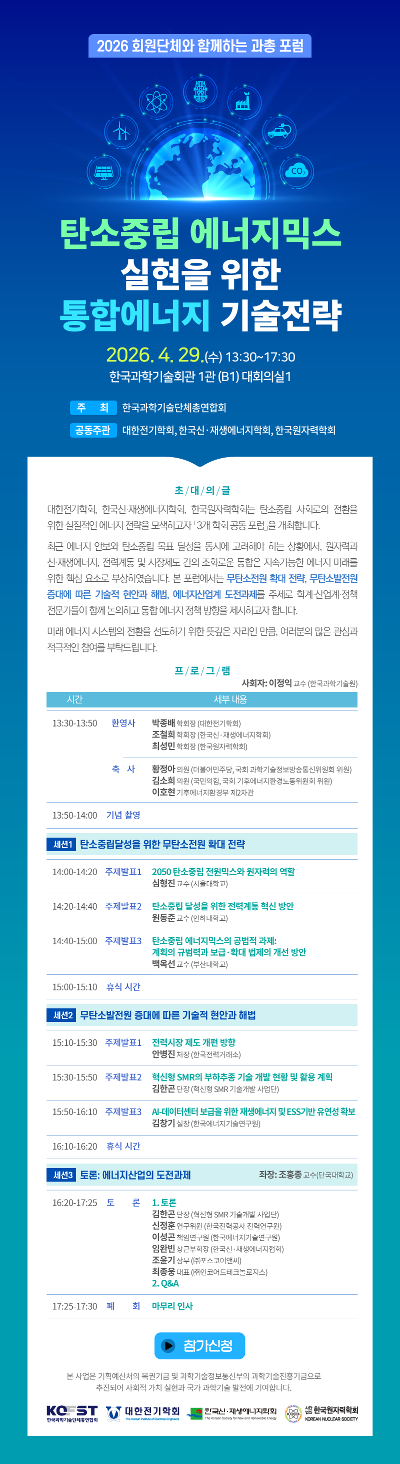 [과총] 2026 회원단체와 함께하는 과총 포럼 개최 안내 : 탄소중립 에너지믹스 실현을 위한 통합에너지 기술전략 작성자 : 대한환경공학회 작성일 : 2026-04-23 조회수 : 30 목록