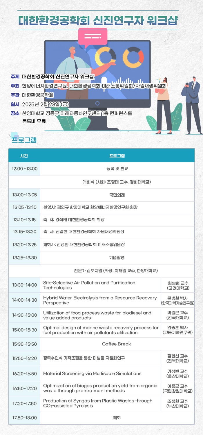 국내 2025 제1회 대한환경공학회 신진연구자 워크샵 개최 안내 일자 : 02.28 (금) Homepage : https://forms.gle/ApPhsUxy3UjdRb2u5 2025 제1회 대한환경공학회 신진연구자 워크샵 개최 안내 2025 제1회 대한환경공학회 신진연구자 워크샵을 아래의 일정으로 개최합니다. 참석 대상자는 대한환경공학회 전 회원이니 많은 참여바랍니다.(등록비 무료) ※ 참석하실 분은 아래 구글폼을 통하여 신청바랍니다. https://forms.gle/ApPhsUxy3UjdRb2u5 첨부파일 2025대한환경공학회 신진연구자 워크샵 최종.jpg (다운 391회) 목록