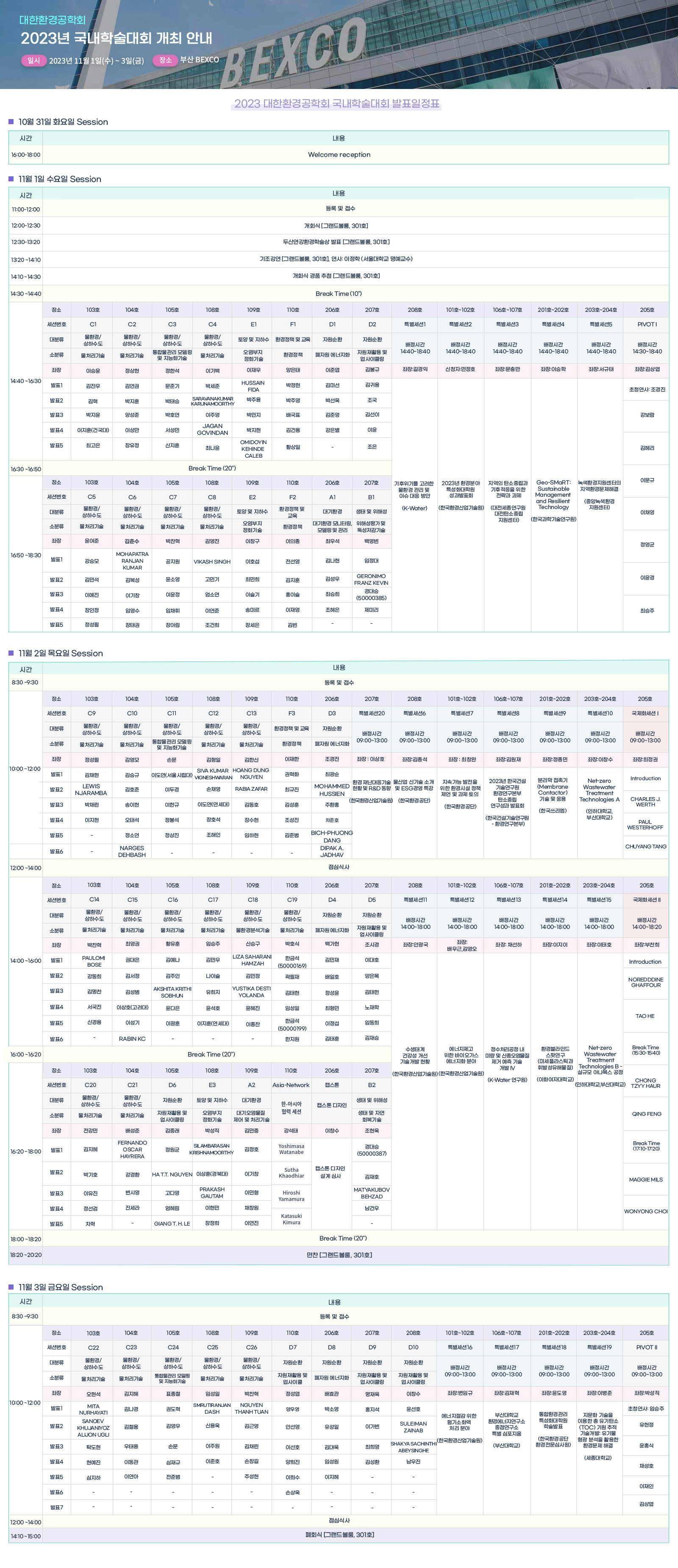 [대한환경공학회] 2023 국내학술대회 일정 안내 작성자 : 대한환경공학회 작성일 : 2023-10-18 조회수 : 2,396 안녕하세요, 대한환경공학회 사무국입니다.다가오는 이번 2023 대한환경공학회 국내학술대회 일정 안내드립니다.자세한 사항은 하단의 일정표를 참고하여 주시길 바랍니다. 뉴스레터 최종_웰컴리셉션ㅇ.png (다운로드 : 268회) 목록